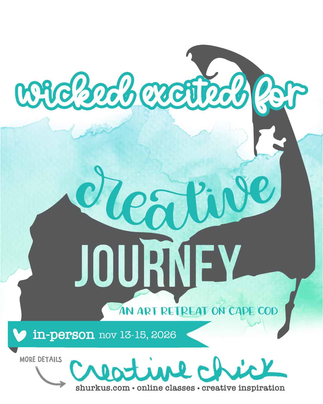 If you are attending and would like to share your excitement on social media, feel free to download this image and share it on Instagram, Facebook, etc. You can tag @jennshurkus and use #CreativeJourneyCapeCod #CreativeChickClasses
