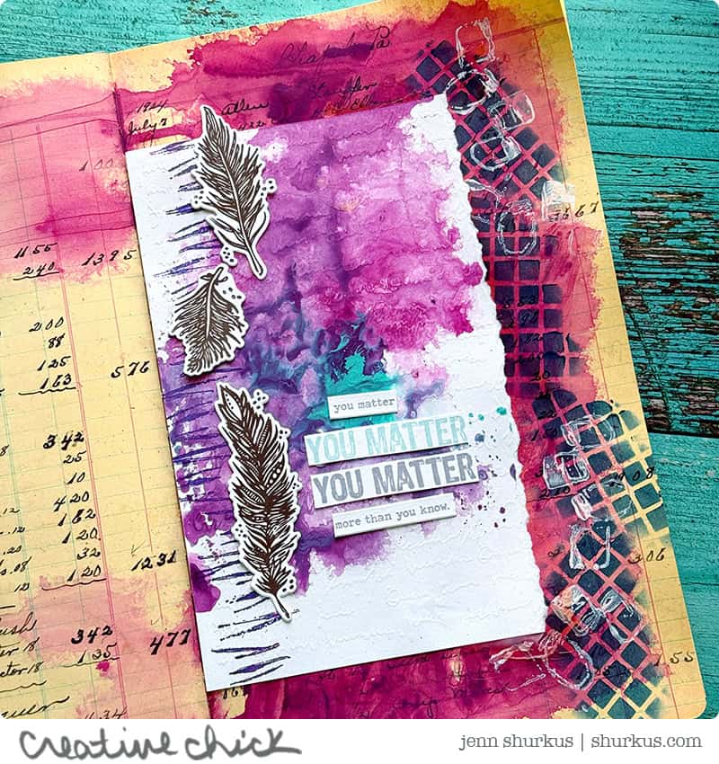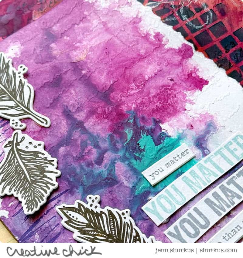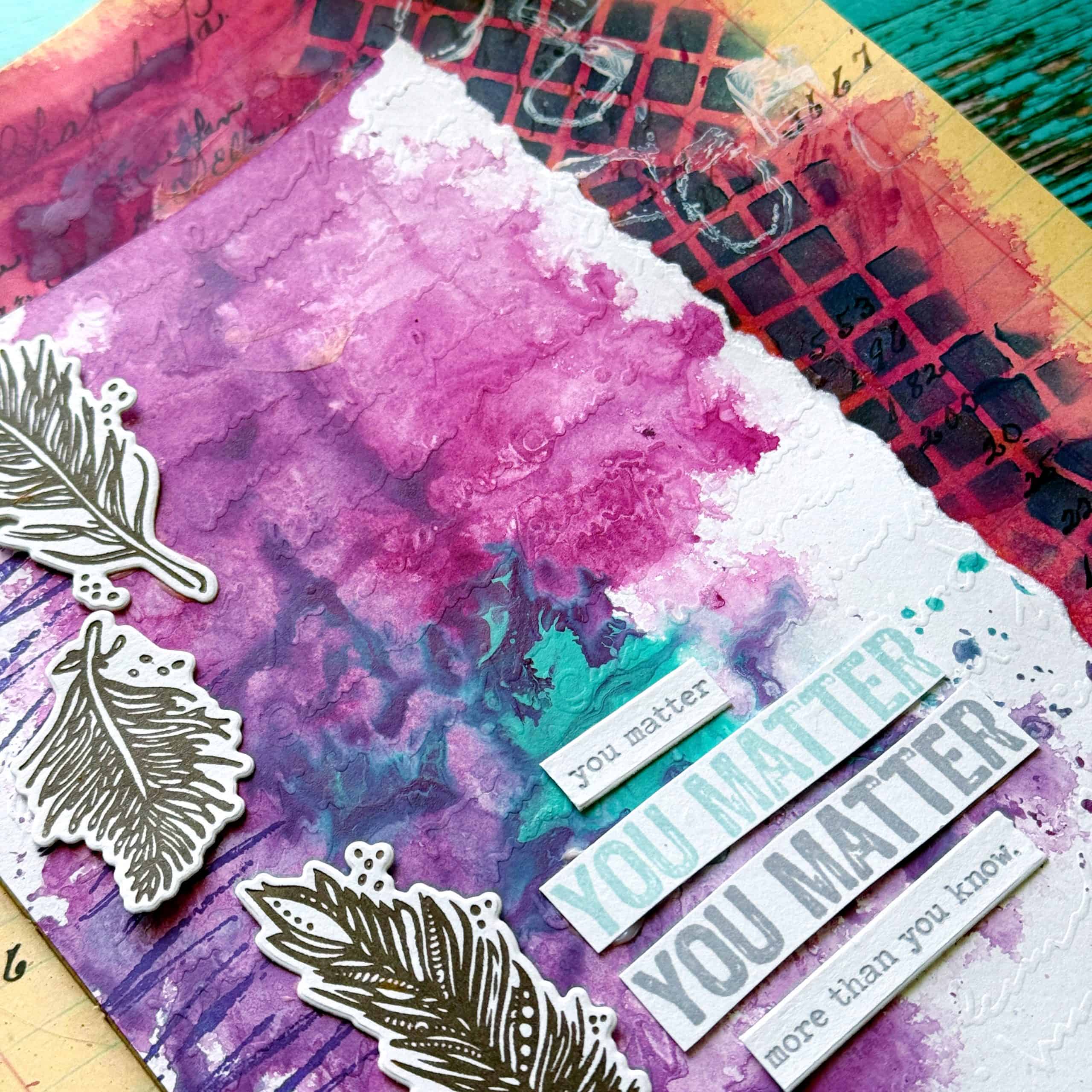 I adhered the painted textured panel to the page and then layered on the die-cut feathers and sentiments to complete the design.