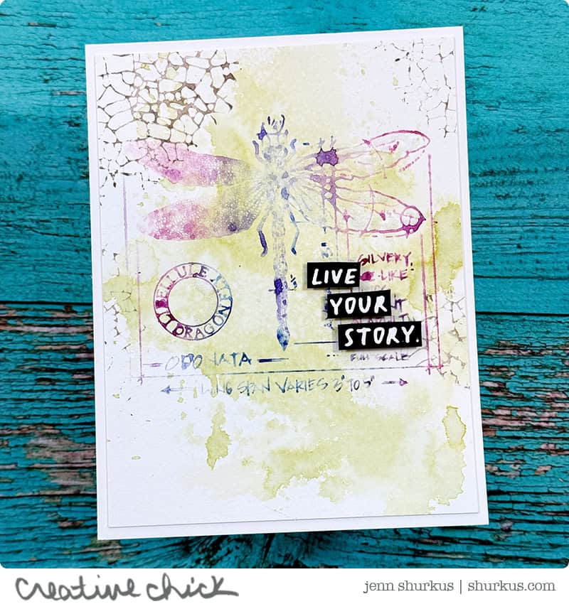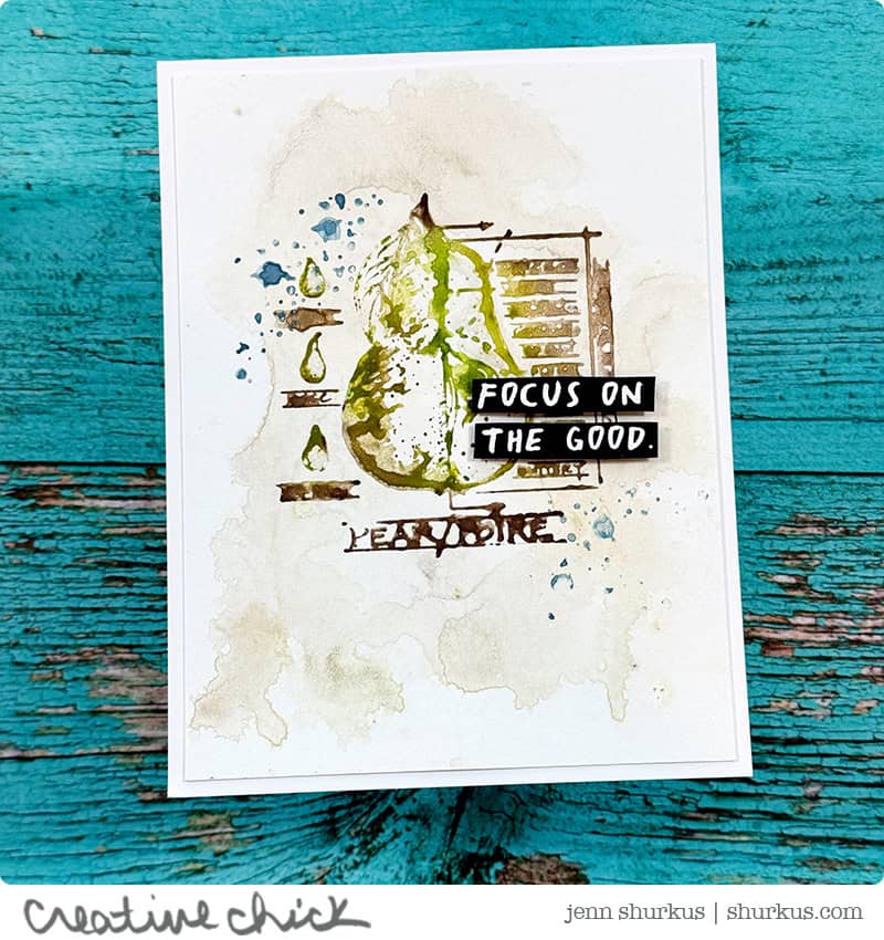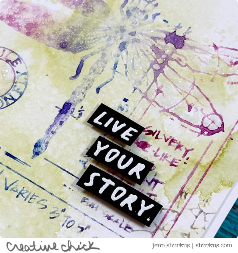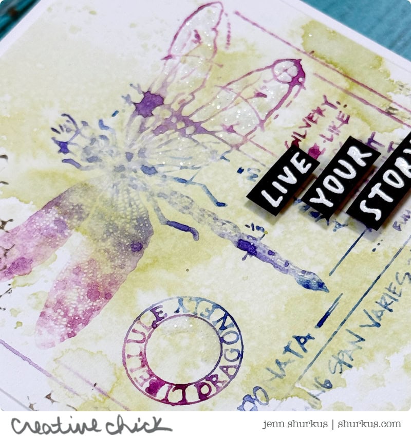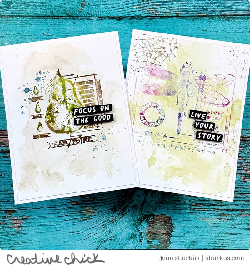 For the sentiments, I heat embossed them in white on black cardstock, then trimmed them down into little pieces of “word-fetti” to add to the cards. As a finishing touch, I added Distress Rock Candy Clear to the dragonfly wings and a bit of the pear for subtle sparkle and texture.