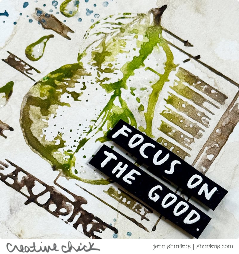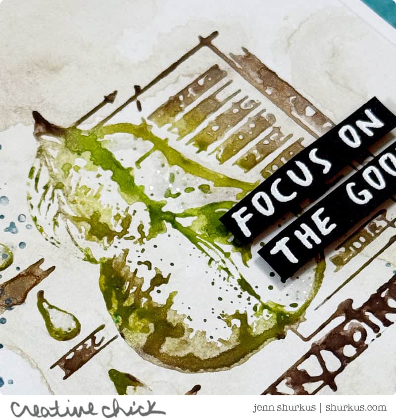 Once the backgrounds were dry, I pulled out one of my favorite Stampers Anonymous Classic stamp sets. Instead of inking the stamp traditionally, I scribbled Distress Watercolor Pencils directly onto the stamp, using several colors at once. I then misted the stamp with water from a Distress Sprayer and stamped it right over the inky background. This technique creates a beautifully loose, layered look that’s never exactly the same twice.