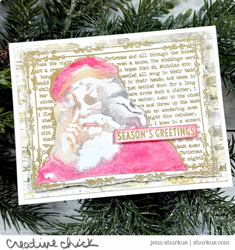 Next, I stamped the same Santa image again using a Versamark ink pad and heat embossed it with gold embossing powder. I fussy cut this gold-embossed Santa and layered it over the watercolored image to create a beautiful, glowing backdrop. I then fussy cut the entire layered piece so it was ready to pop onto the card.