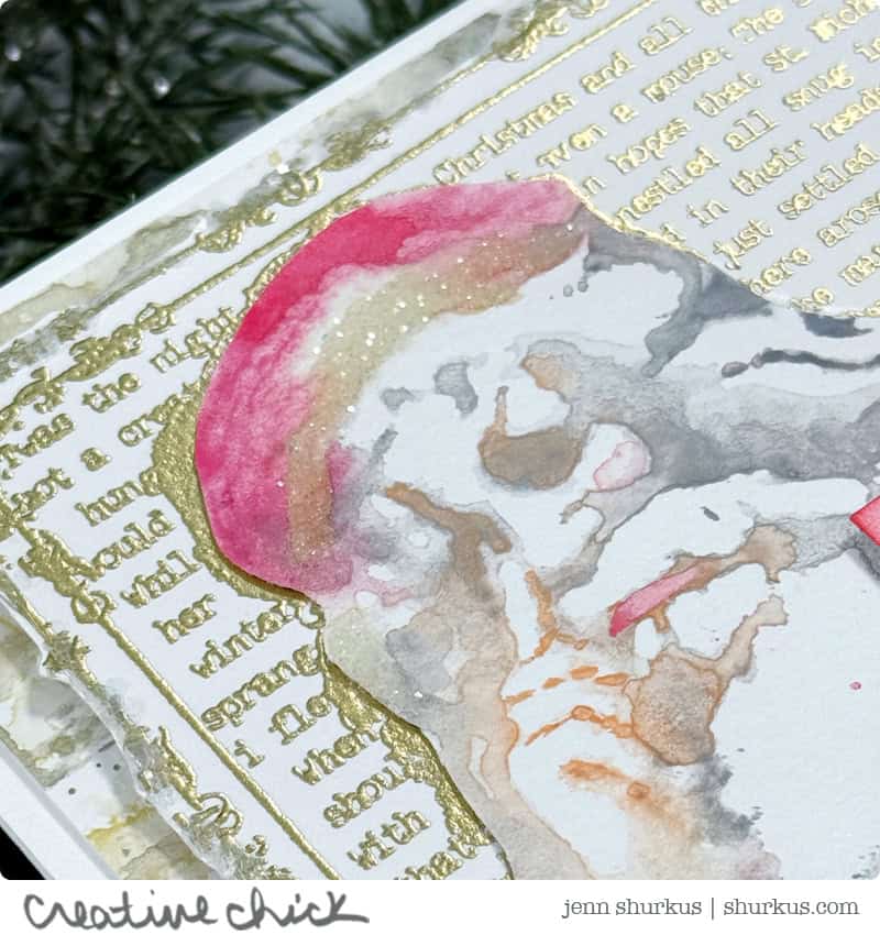 To finish off the card, I added Distress Rock Candy Clear to the trim of Santa’s hat and coat using Distress Collage Medium for subtle sparkle. Around the frame, I sprinkled Distress Rock Candy Chunky and secured it with Glossy Accents for that extra festive shine.