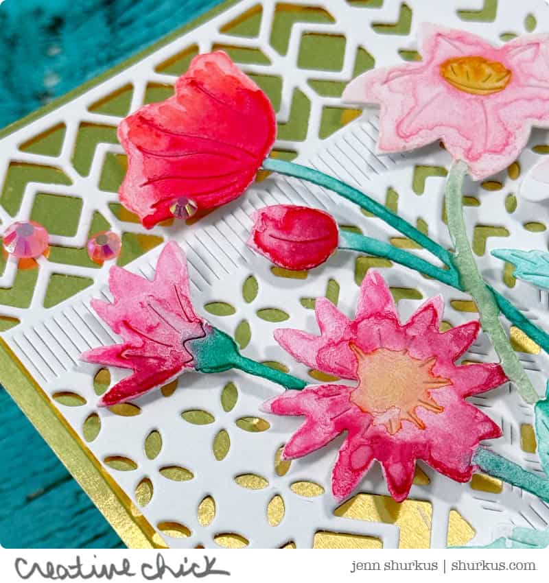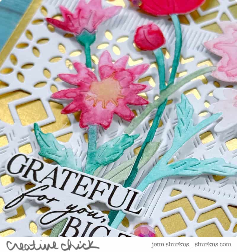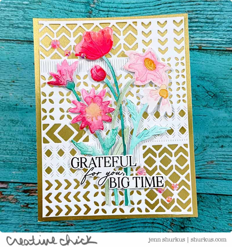 I created the background with the new Modern Design Block die and layered it over gold metallic cardstock for a touch of shine. Then I die-cut the Wildflower Elegance design from Distress Watercolor Cardstock and added color using Distress Watercolor Pencils. The sentiment is from the On My Mind stamp set, and I finished the card with a few Bubblegum Jewels for extra sparkle.