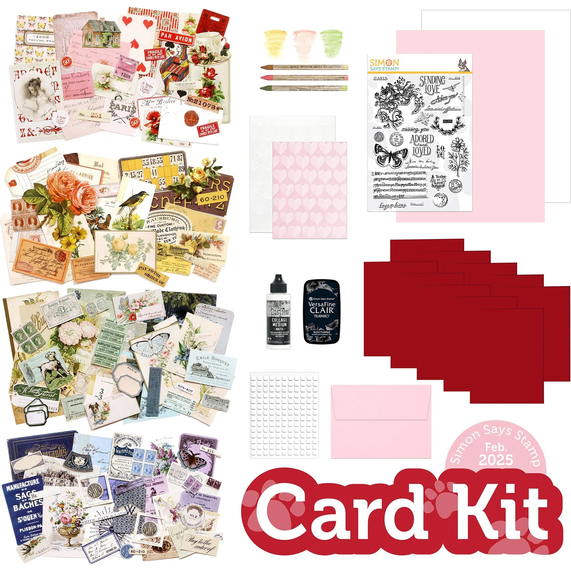 Hello everyone! Today, I am sharing a few mixed media cards I created with Simon Says Stamp’s February Card Kit, Distressed Vintage Noted! This kit is overflowing with products: a 6×8 stamp set, an embossing folder, Tim Holtz Idea-ology ephemera package, Distress Watercolor Pencils, and more! There are many products, and this kit is perfect for anyone!