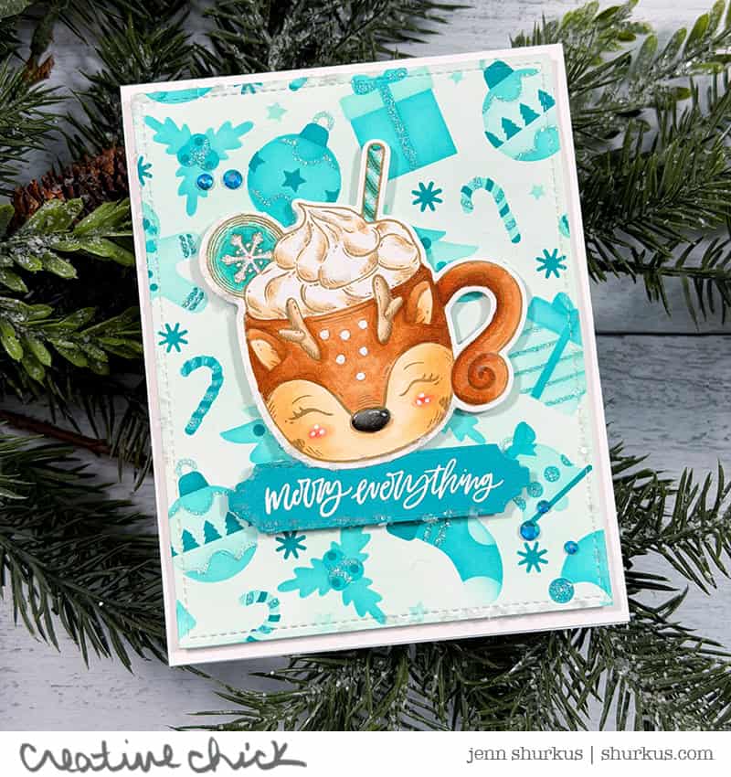For the background, I used the Very Merry Layering Stencil, which is fantastic for creating quick and eye-catching designs. You can keep things simple with a monochromatic color palette like I did here, or mix things up with multiple colors for a totally different look. There’s also a coordinating die set that lets you cut out some of the sweet images to use as focal points on your cards, always a win.