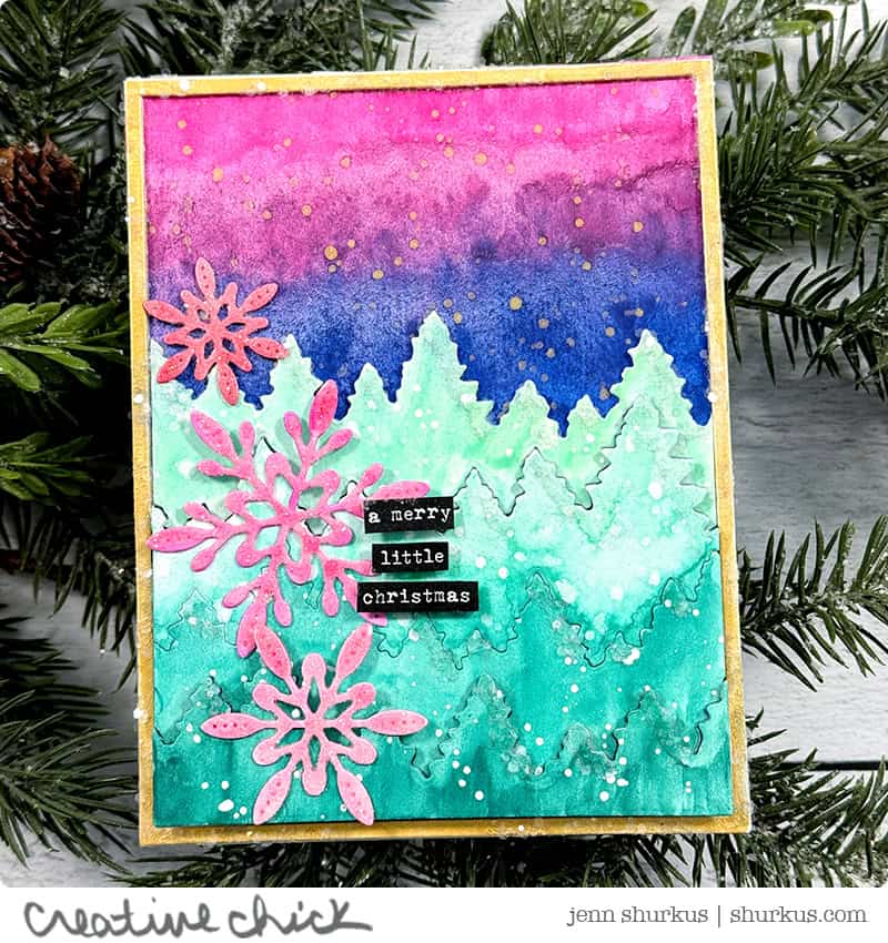 For this card, I really let the Distress Watercolor Pencils shine. I wanted to create a beautiful gradient of greens, from deep and rich to soft and light, across the die-cut trees. After cutting them from Distress Watercolor Cardstock, I painted each one using Pine Needles, Evergreen Bough, and Cracked Pistachio.