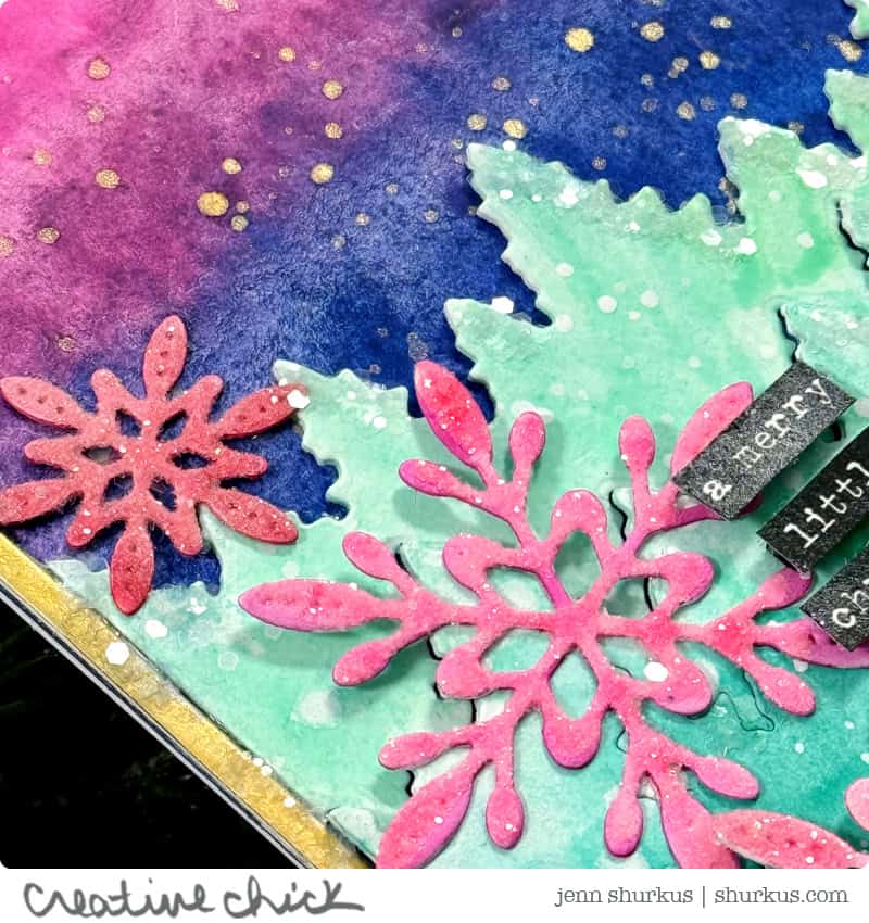 To build depth and dimension, I adhered the trees at varying heights, stacking die cuts and using foam squares. I finished the snowflakes with a coat of Distress Rock Candy Clear applied with Distress Collage Medium, and added Distress Rock Candy Chunky along the edges of the trees for that perfect frosty sparkle.
