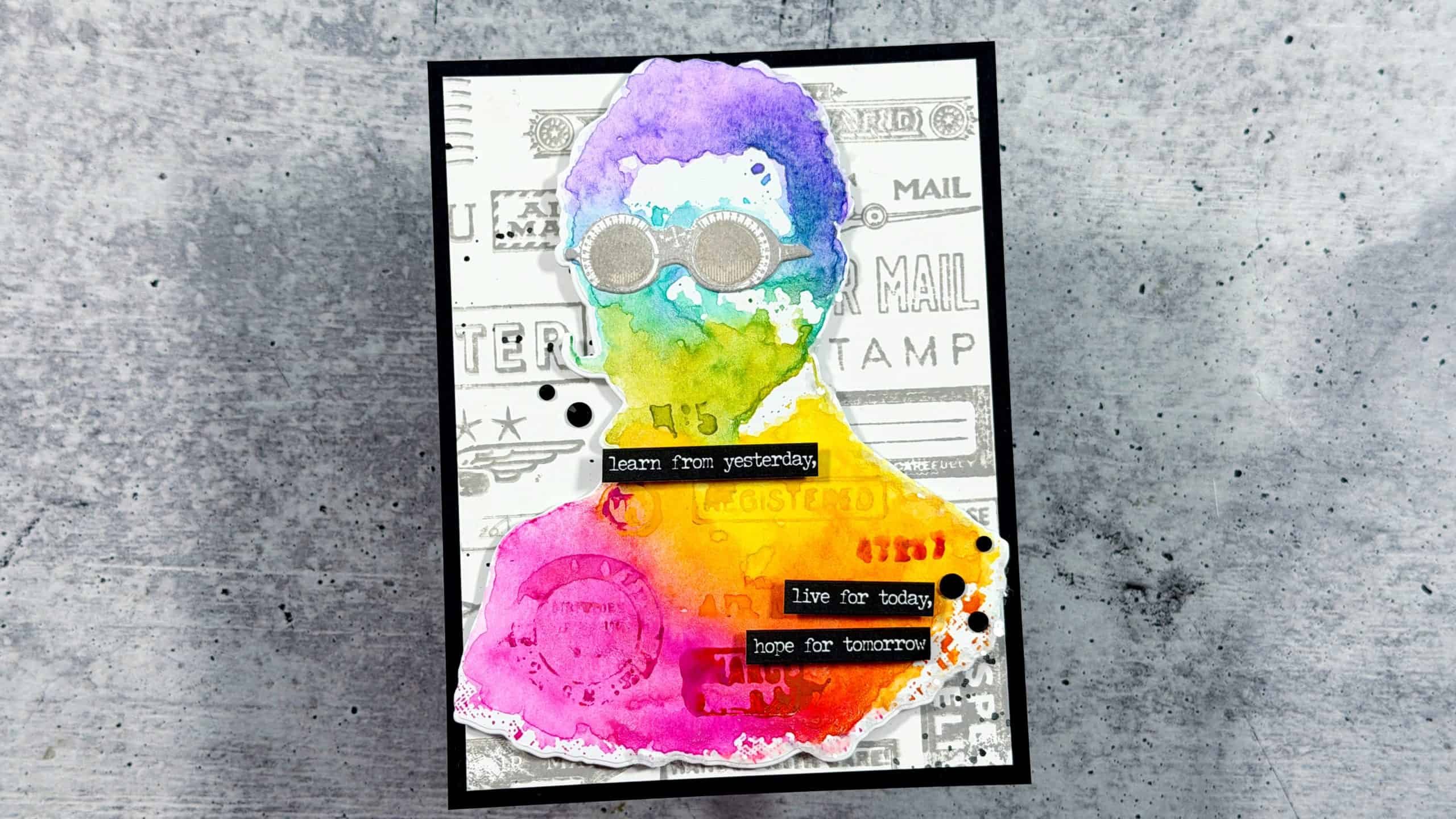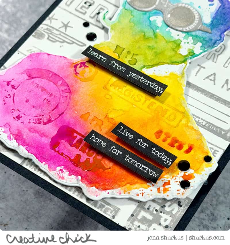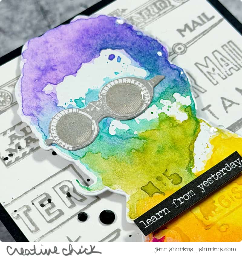 To add even more interest, I scribbled Distress Watercolor Pencils directly onto a few of the Correspondence images and stamped them in coordinating areas on the professor’s jacket. I love how this ties the background and focal image together while adding subtle detail.