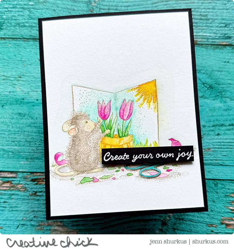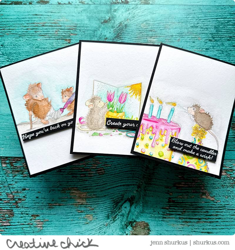 Hello everyone! I have some fun cards to share with you that I created with some of Spellbinders‘ House Mouse Everyday Collection. House Mouse has been around in the stamping community for a long time now. I have been making cards since 1999, and I do believe some of my first wood-mounted stamps were some House Mouse images. I had a lot of fun creating these cards, and watercoloring these images. It brought back a lot of fond memories.