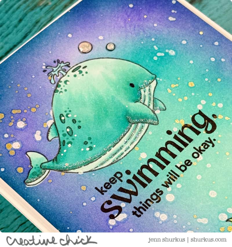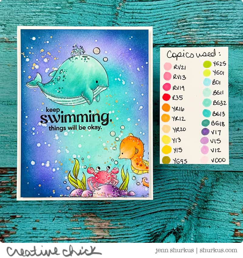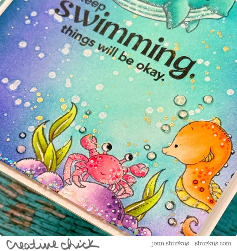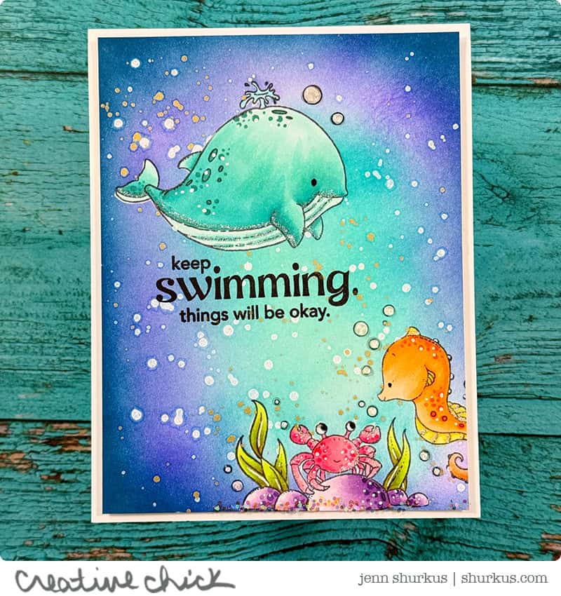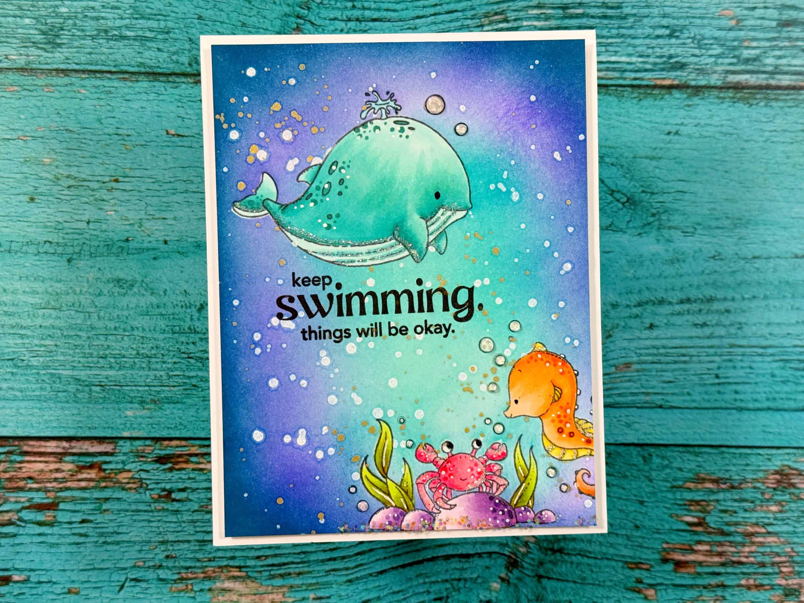 I had so much fun creating this cheerful under-the-sea card! I blended the background with ocean-inspired Distress inks and added some shimmer and bubbles for extra magic. The sweet critters and encouraging sentiment; “Keep swimming, things will be okay”, felt like the perfect reminder to send a little hope and happiness.