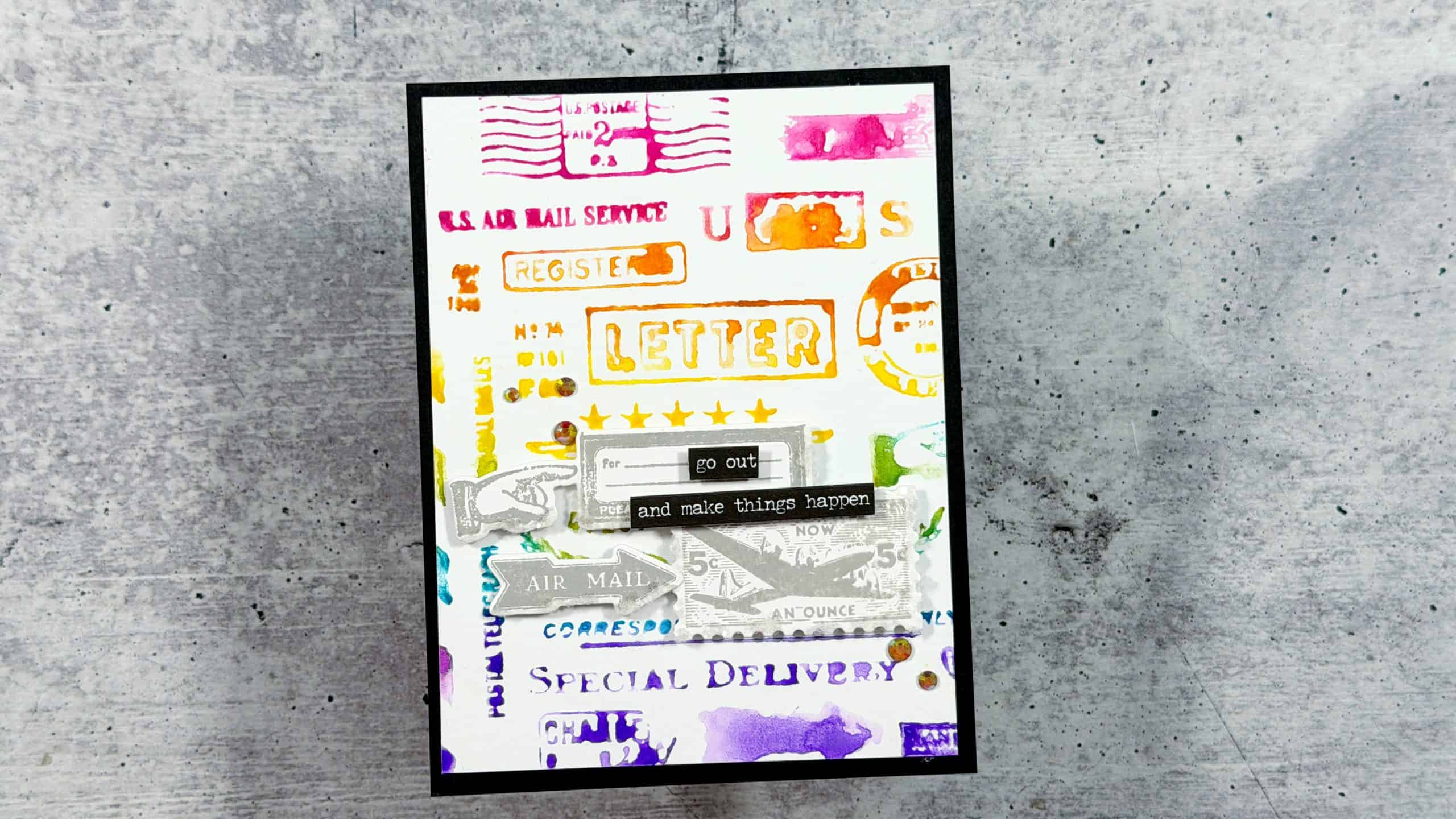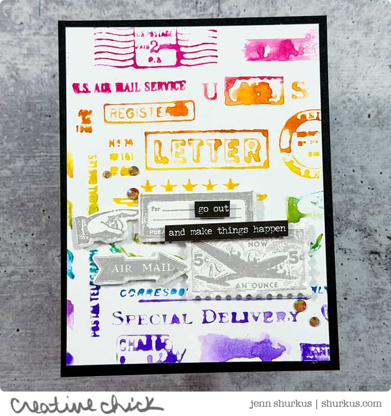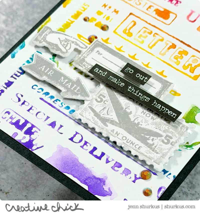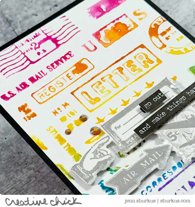 To add more interest and dimension, I stamped a few additional postal images using Hickory Smoke Distress Oxide Ink and die cut them with the new coordinating dies. I collaged these pieces on top of the rainbow background, allowing some areas to overlap for a more organic look.