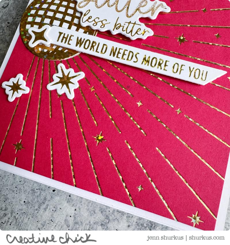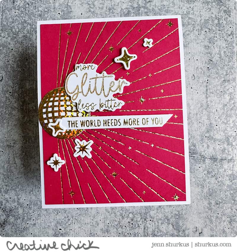 I sometimes forget just how fun hot foiling on colored cardstock can be, until I do it again and fall in love all over. The foil is already so beautifully shiny, but I couldn’t resist taking it one step further. I added a touch of Prisma Glitter to the word “glitter” with a Quickie Glue pen… because honestly, it just needed it. 😉