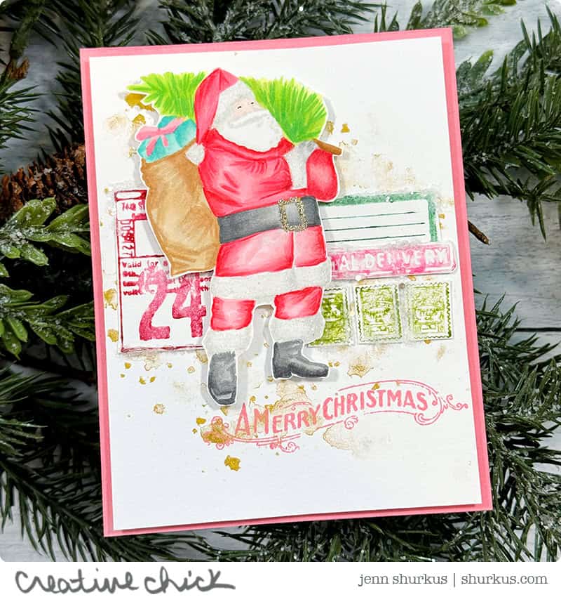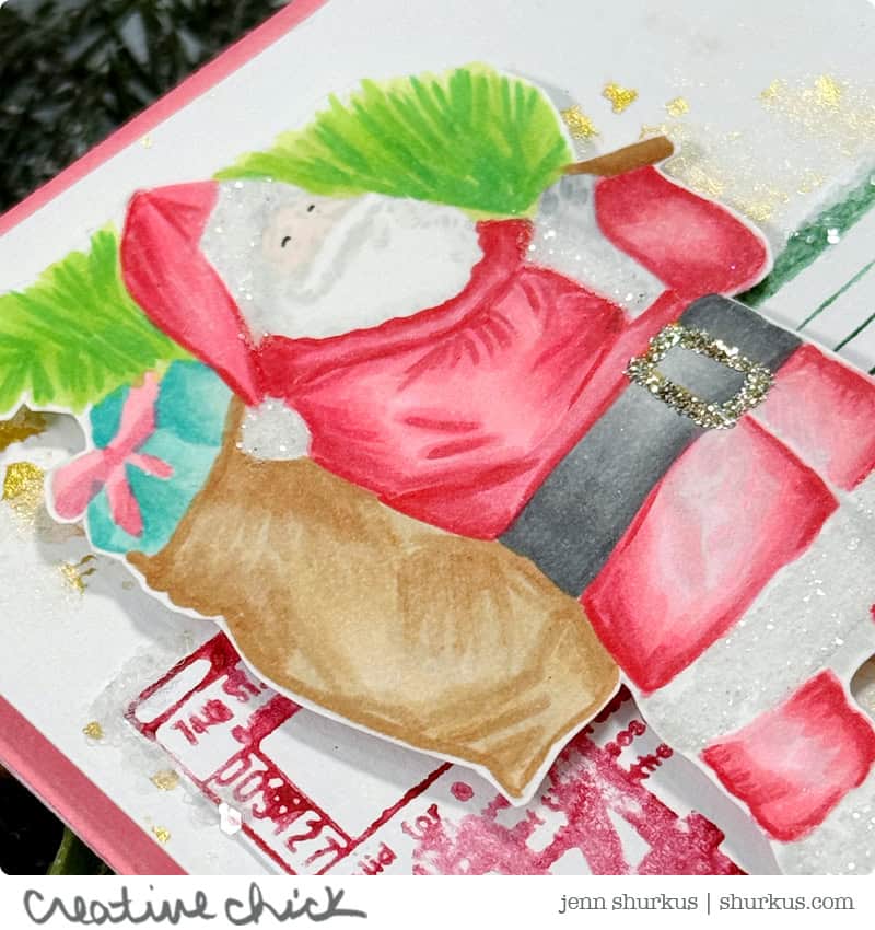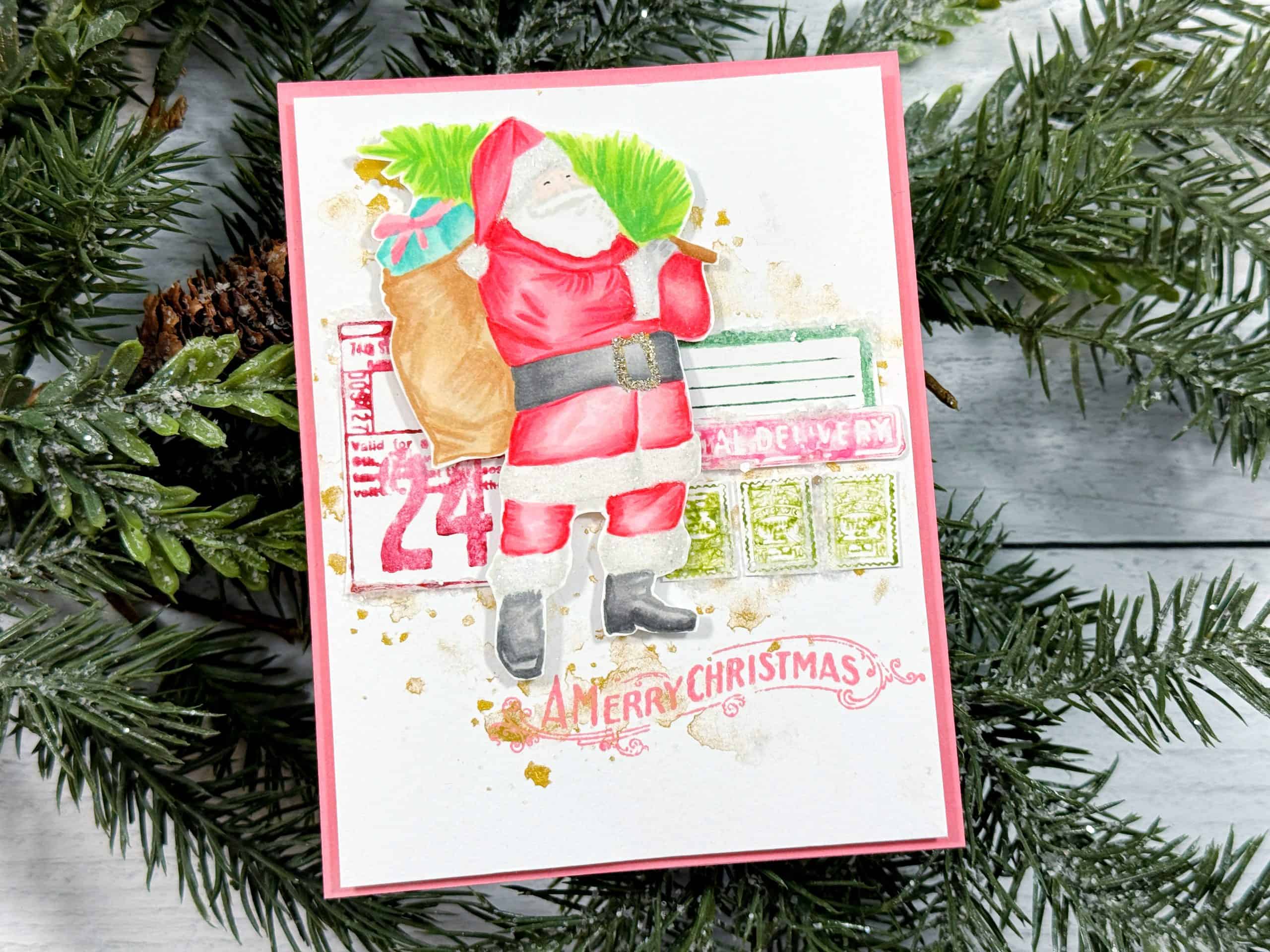 The sentiment was stamped using Worn Lipstick Distress Oxide, which ties in perfectly with the reds in Santa’s suit while keeping the look soft and cohesive.