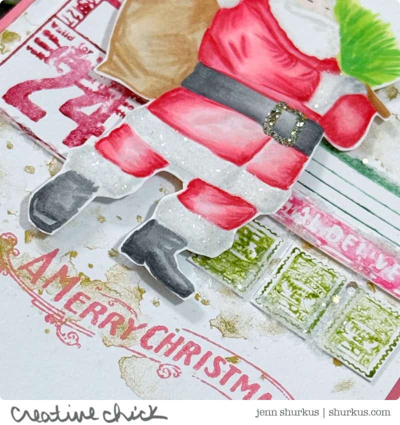 Of course, no Santa is complete without a little sparkle. I added Distress Rock Candy Clear to all the trim on Santa’s outfit for snowy texture, along with a touch of gold glitter on his belt buckle. To finish everything off, I sprinkled Distress Rock Candy Chunky around the collage elements for even more dimension and shine.