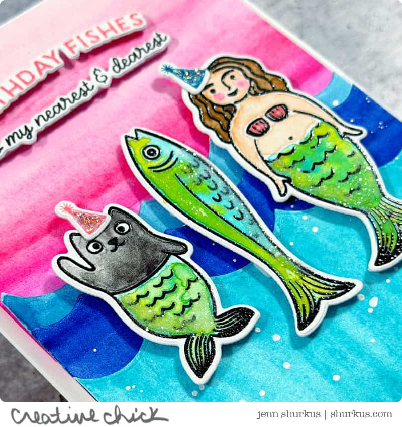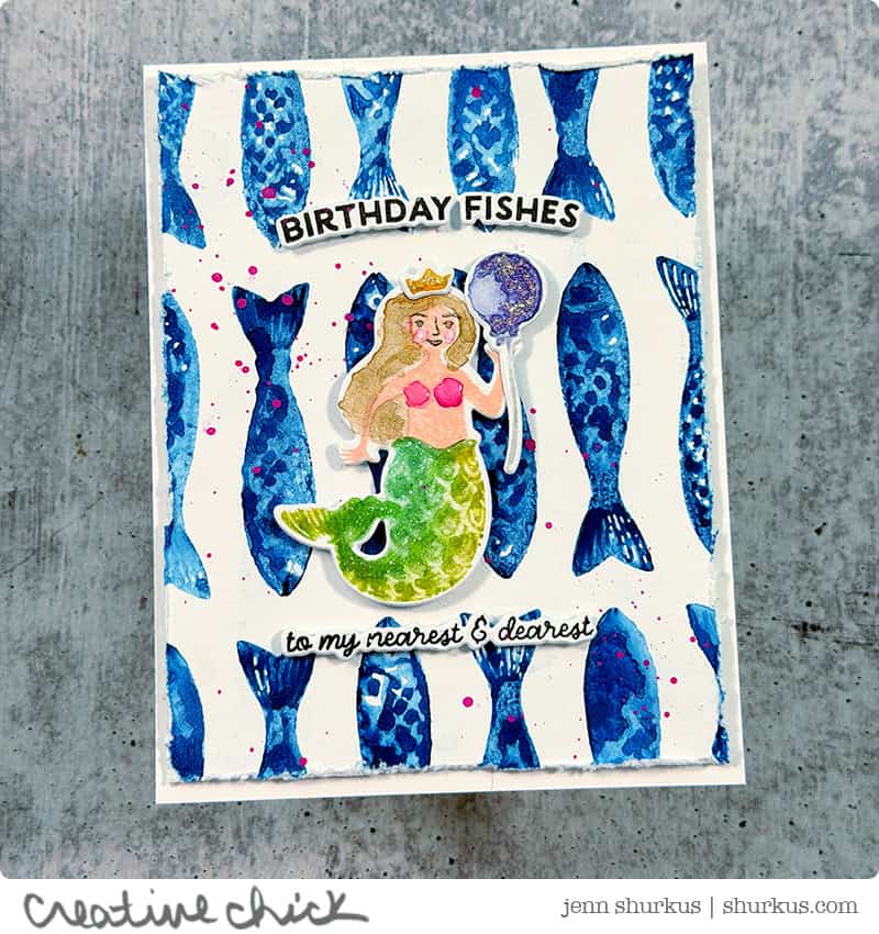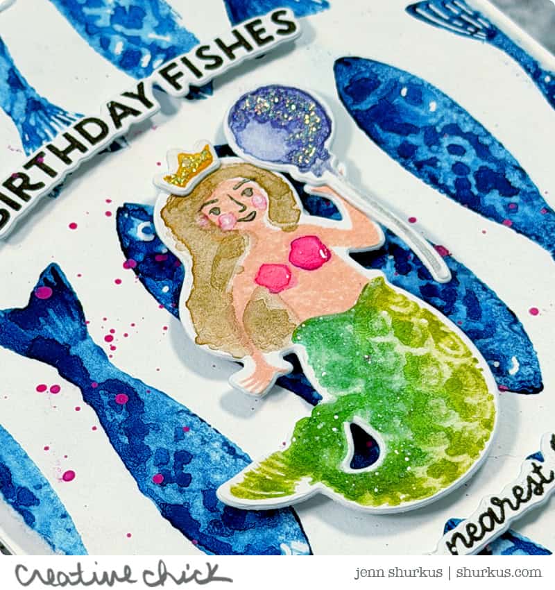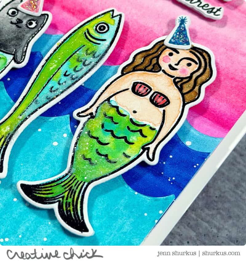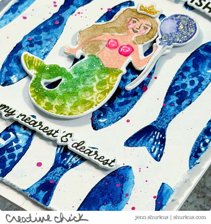 For this card, I primarily used Distress Watercolor Pencils directly on the stamps, which gives the images a loose, painterly feel. For the mermaid’s body, I switched to Distress Oxide ink to make sure the shape stayed nice and crisp. I finished things off with a few favorite details, a touch of Glossy Accents on her shell top, Distress Rock Candy Clear on her tail, and Stickles on her crown and balloon for extra sparkle and shine ✨