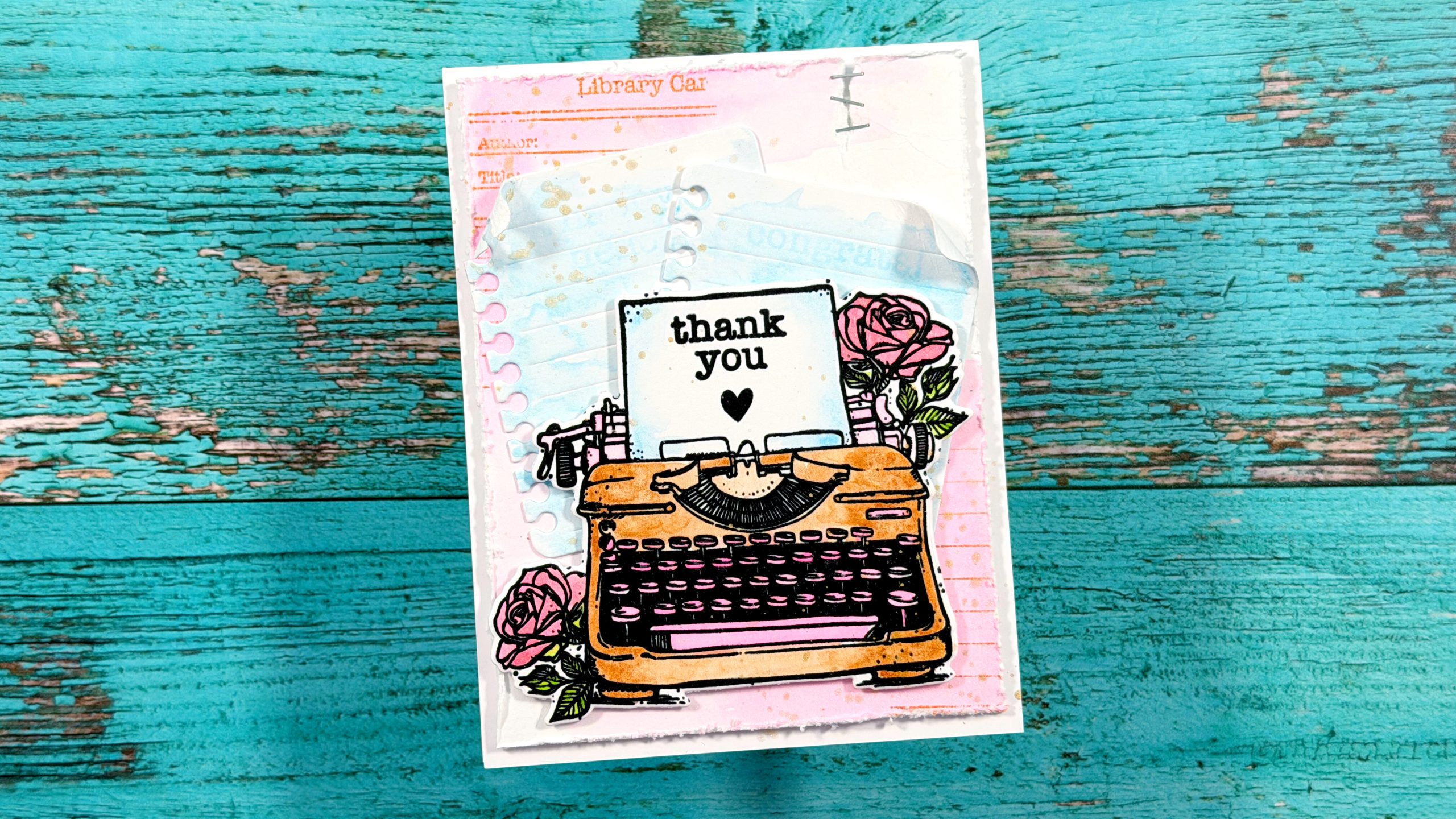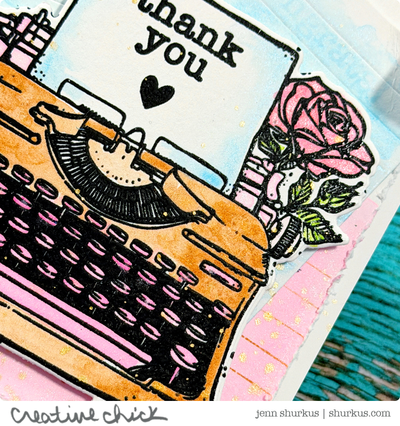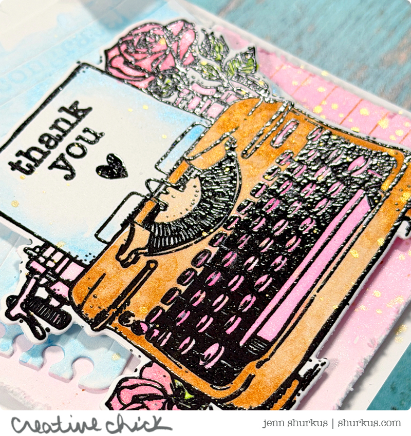 I started by stamping, embossing, and die-cutting the typewriter from the Typed Greetings stamp set. Then I watercolored it using the Pink & Main Twinkle Inks, if you haven’t tried these yet, they have the most gorgeous shimmer to them. I am obsessed.