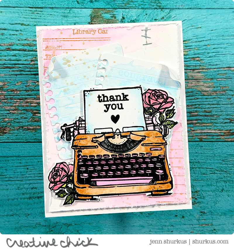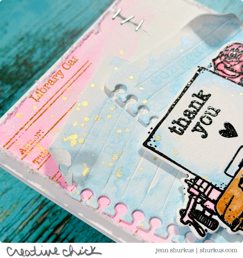 For the background, I did a loose watercolor wash with the Twinkle Inks, and once that dried, I stamped the Library Card stamp over it for a little extra texture.