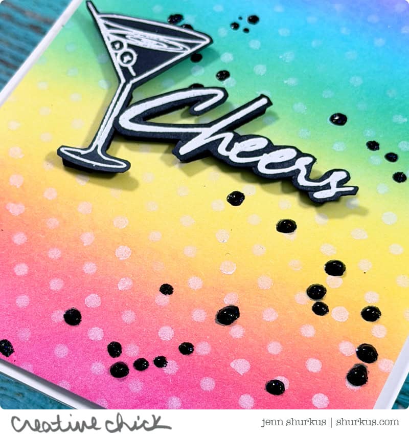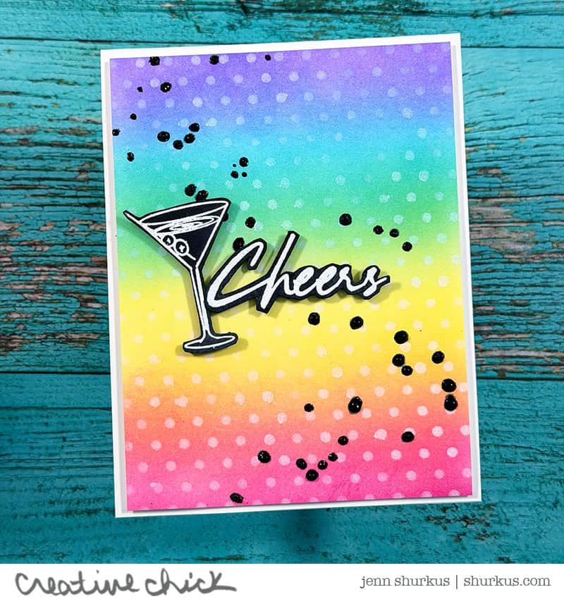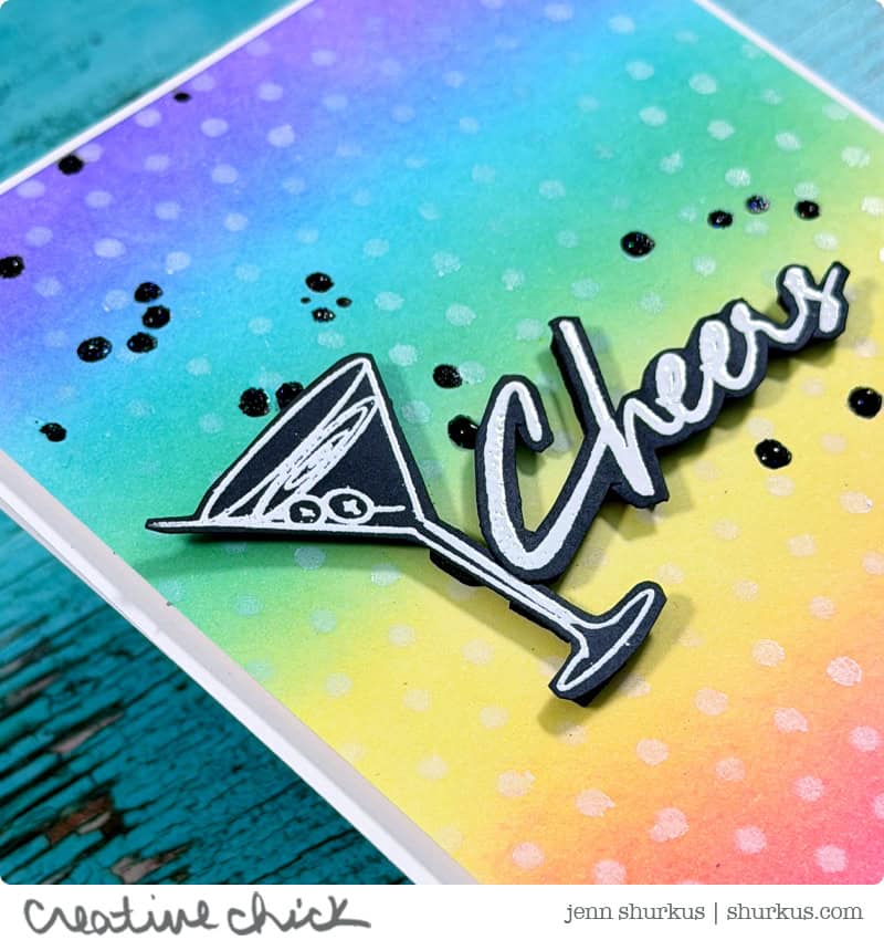 For the focal images, I stamped and white heat embossed the martini and “cheers” sentiment from the Chic Birthday stamp set. I fussy cut them out and adhered them with foam squares for dimension. To finish things off, I went back over some of the black splatters with Black Diamond Stickles for a subtle touch of sparkle.