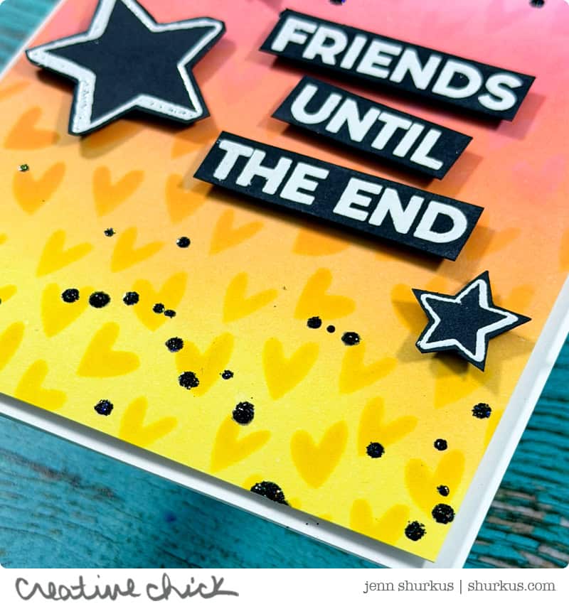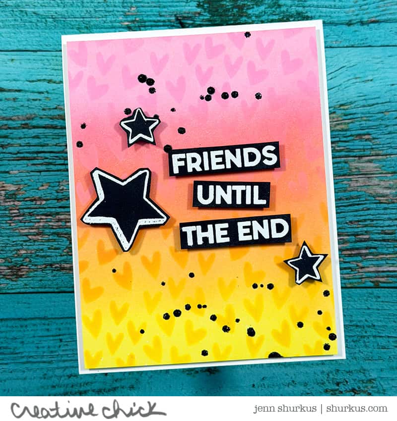 I then layered in some pattern using Distress Oxide Inks: Kitsch Flamingo, Worn Lipstick, Spiced Marmalade, and Mustard Seed, pressed through the Sprinkle Hearts Stencil. The Make-Art Stay-tion came in handy here too, keeping everything lined up while blending.