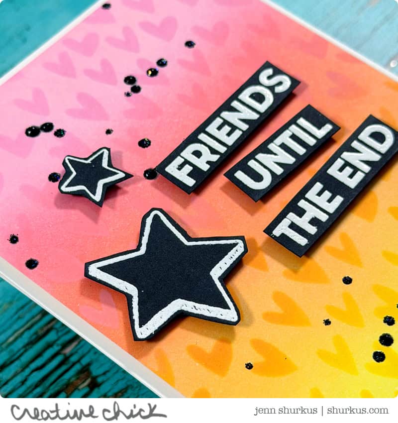 The stars and sentiment were stamped and white heat embossed from the Charmed stamp set, fussy cut, and popped up with foam squares. Just like the first card, I added a little Black Diamond Stickles to some of the splatters for extra sparkle.