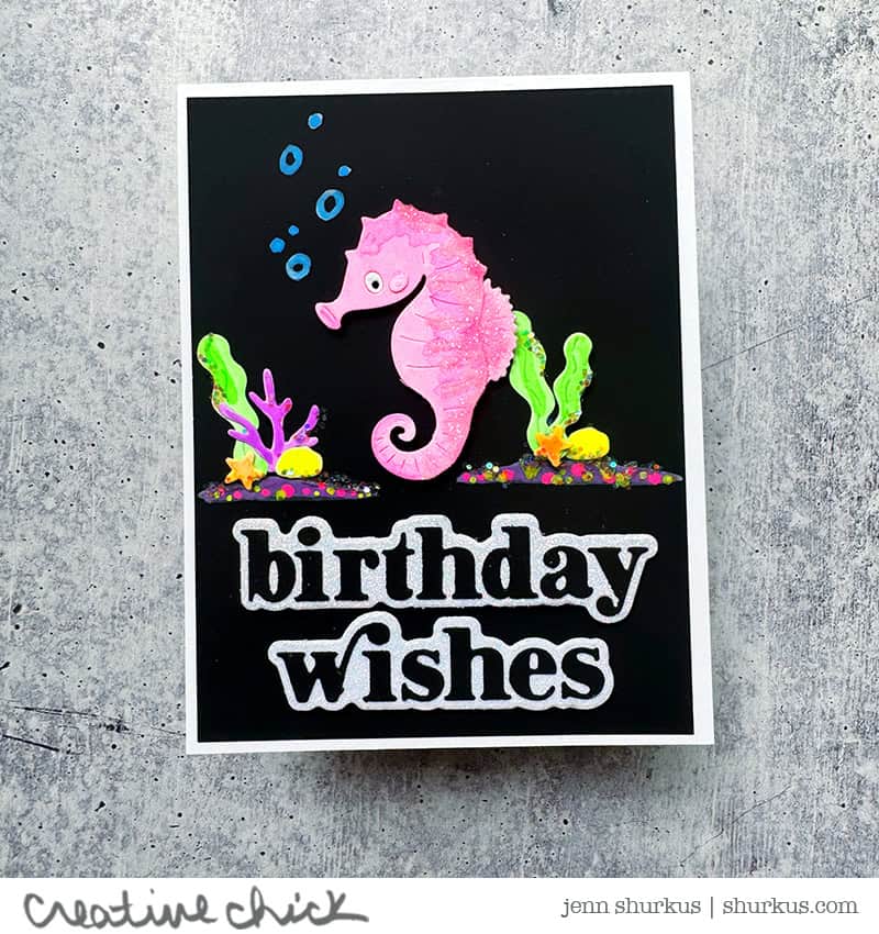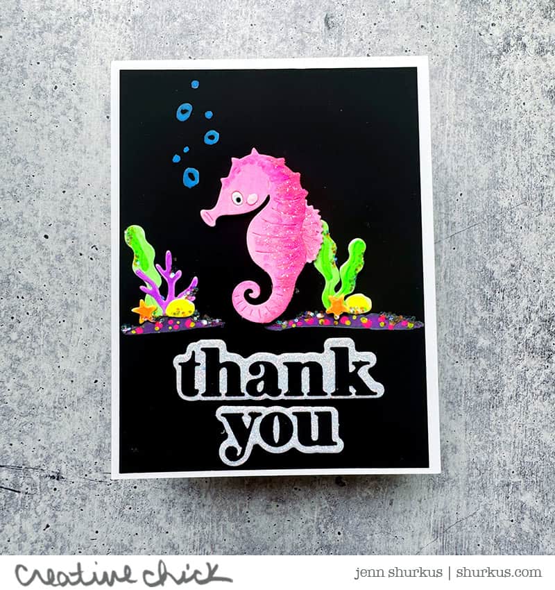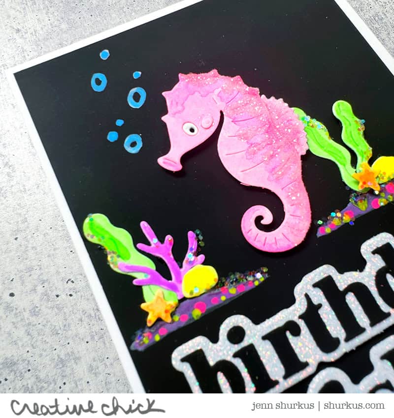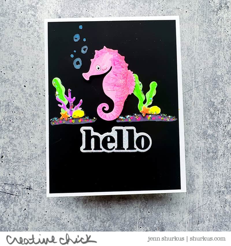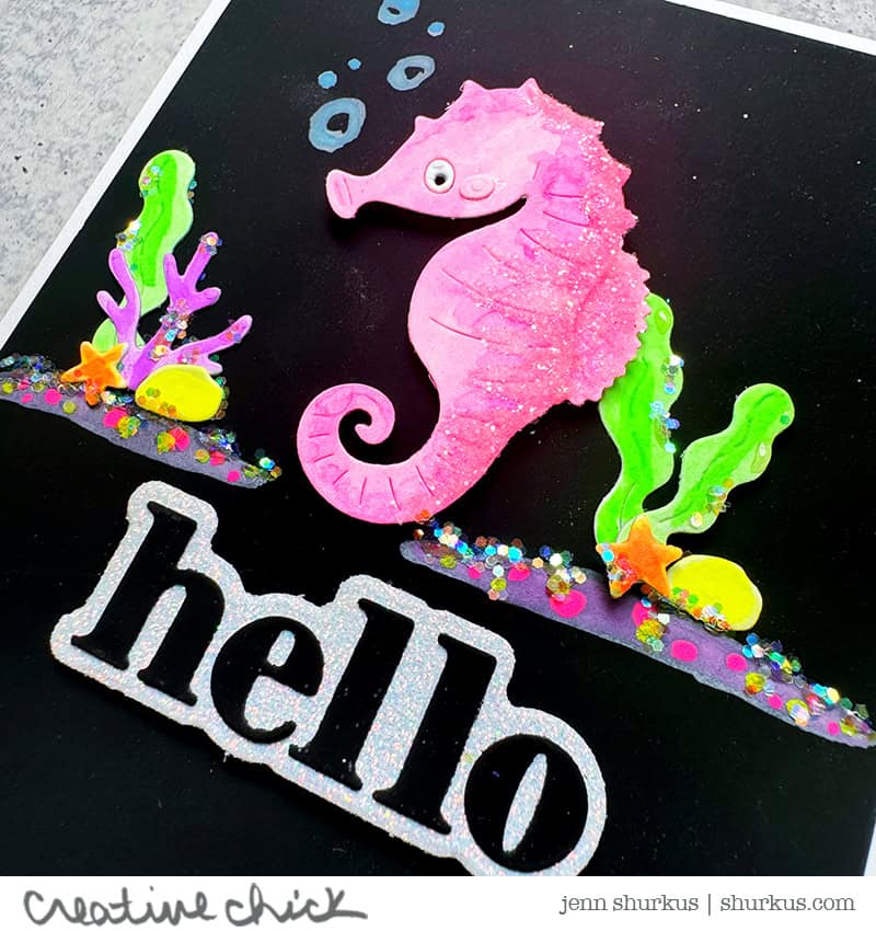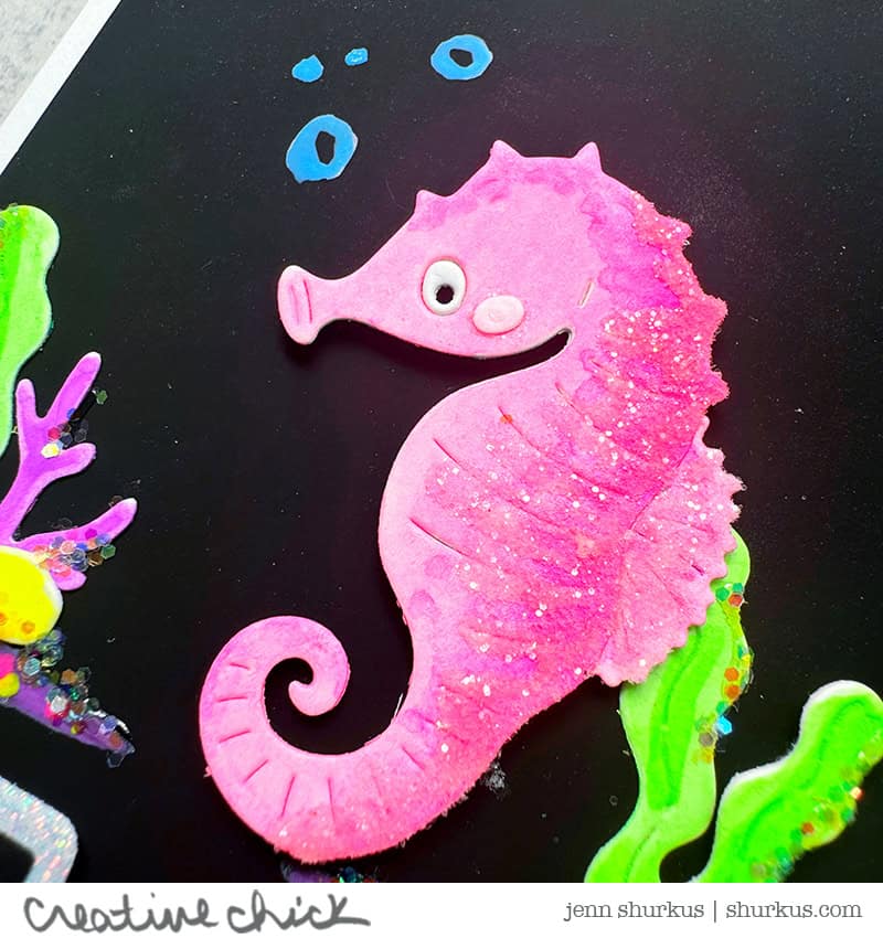 To finish things off, I added Distress Rock Candy Clear to the seahorse details for a touch of texture and sparkle, and sprinkled Lawn Fawn Chunky Glitter along the ocean floor for some playful underwater shimmer.