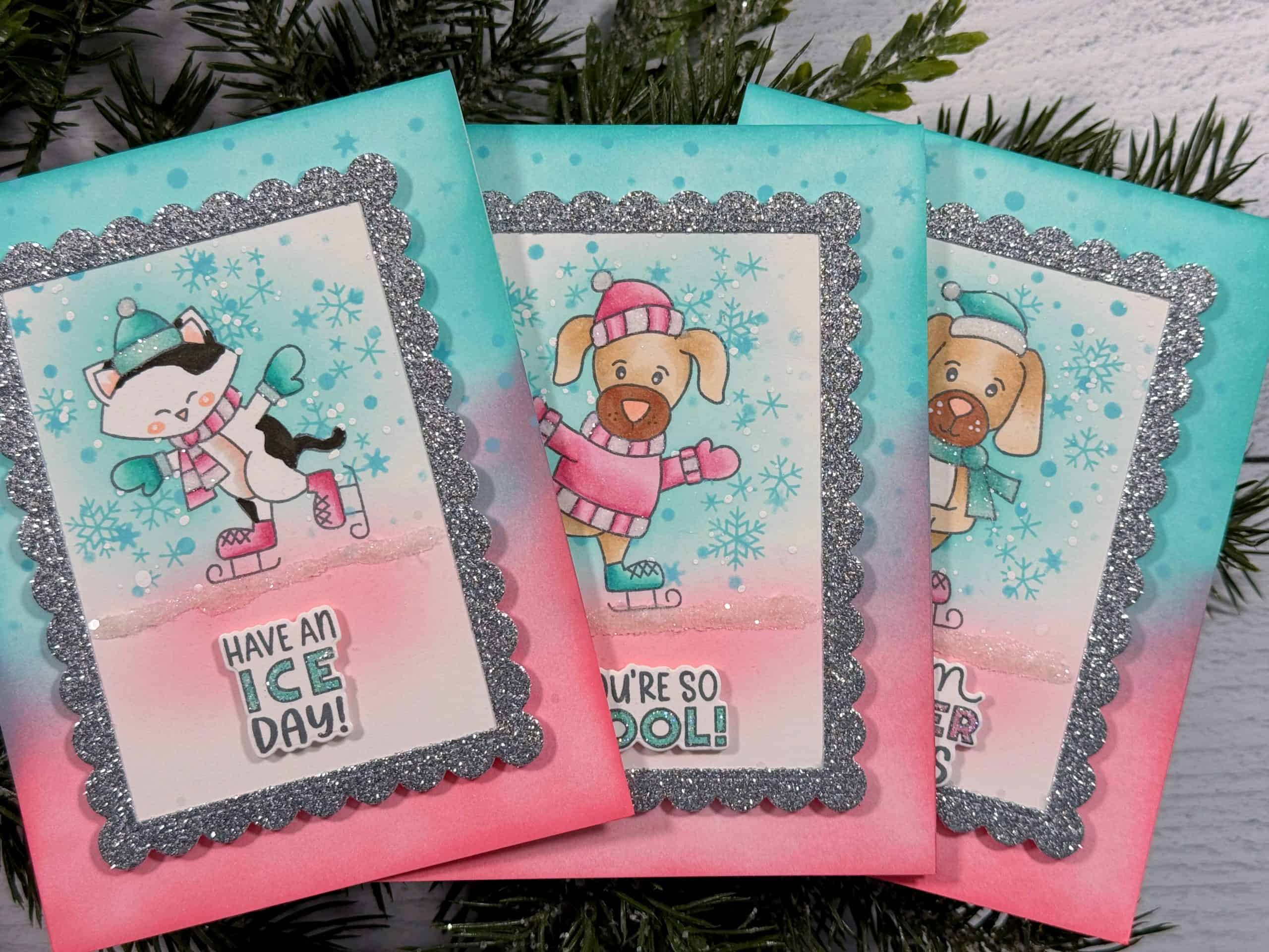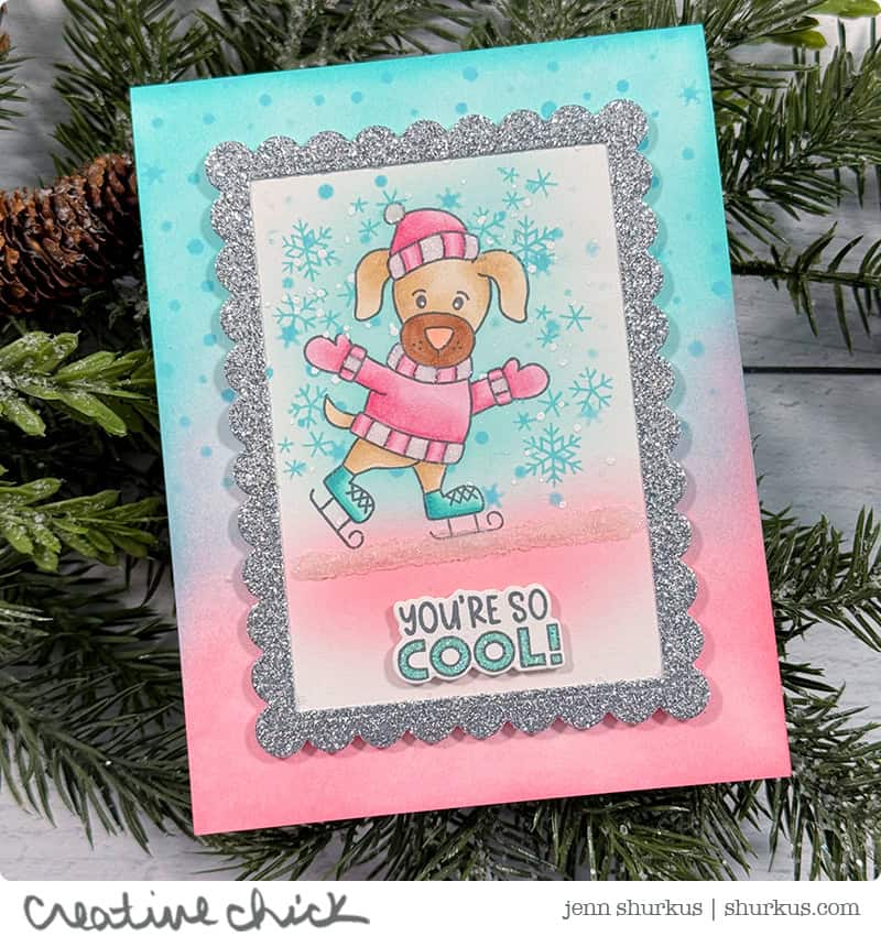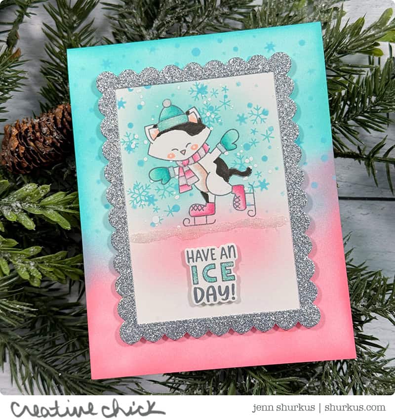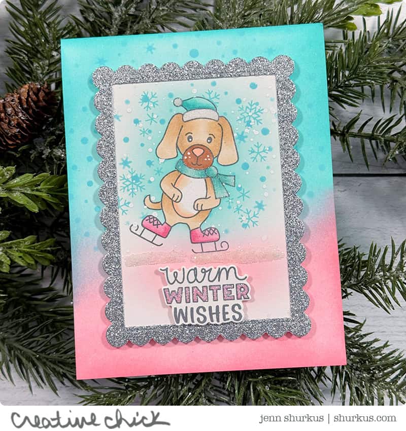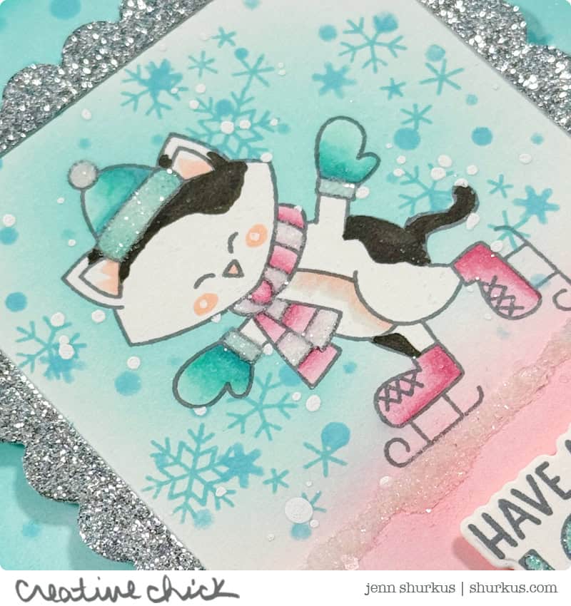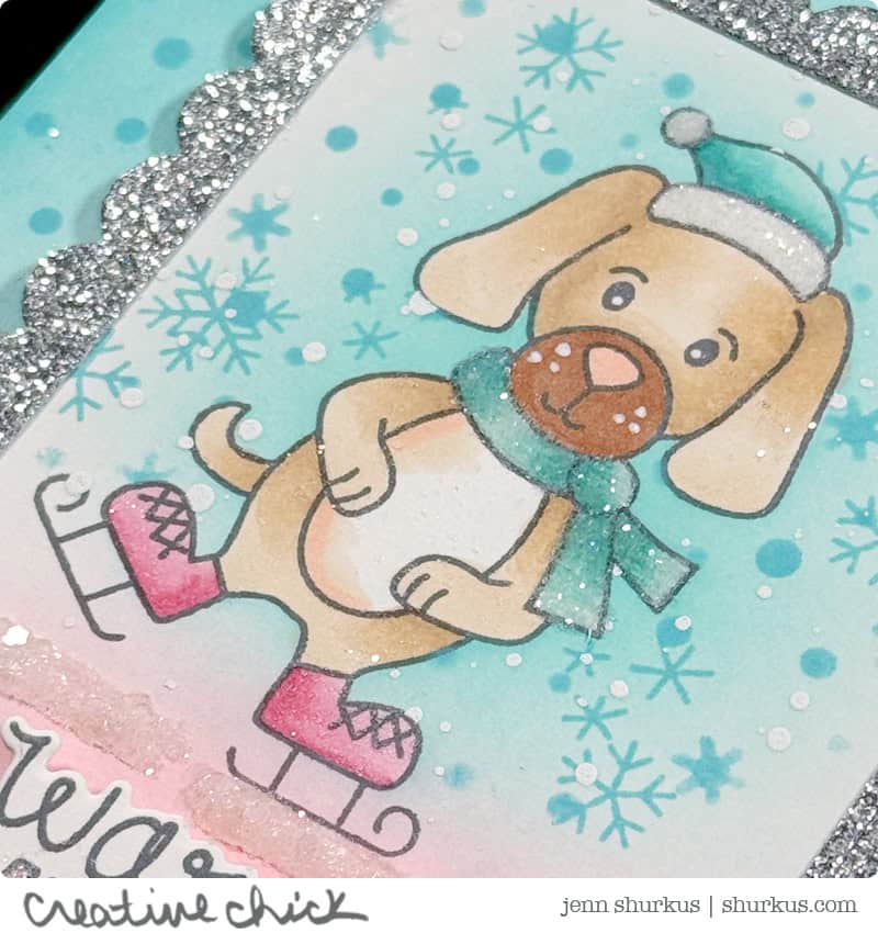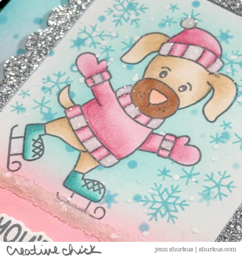I added Prisma glitter on the open letters on the sentiments. I added Distress Rock Candy to the accents on the animals and along the ground to give an icy look. I used Glossy Accents to hold onto the glitter.