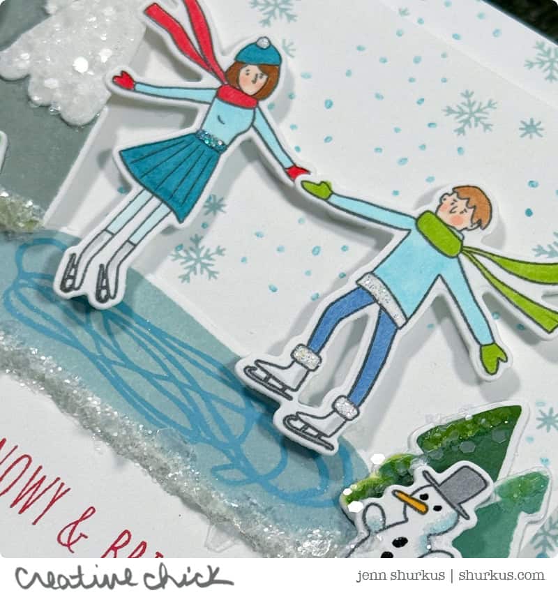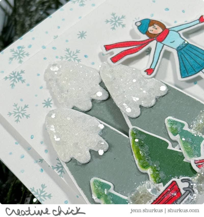 I did use a mix of Distress Rock Candy and Distress Rock Candy Chunky on the snowy mountain tops, and Distress Snowflakes along the pond. I adhered these with with Distress Collage Medium. I also used Glossy Accents here and there on the trees to add some Distress Rock Candy Chunky for an extra sparkle.