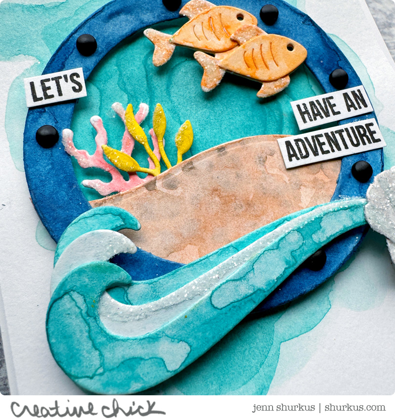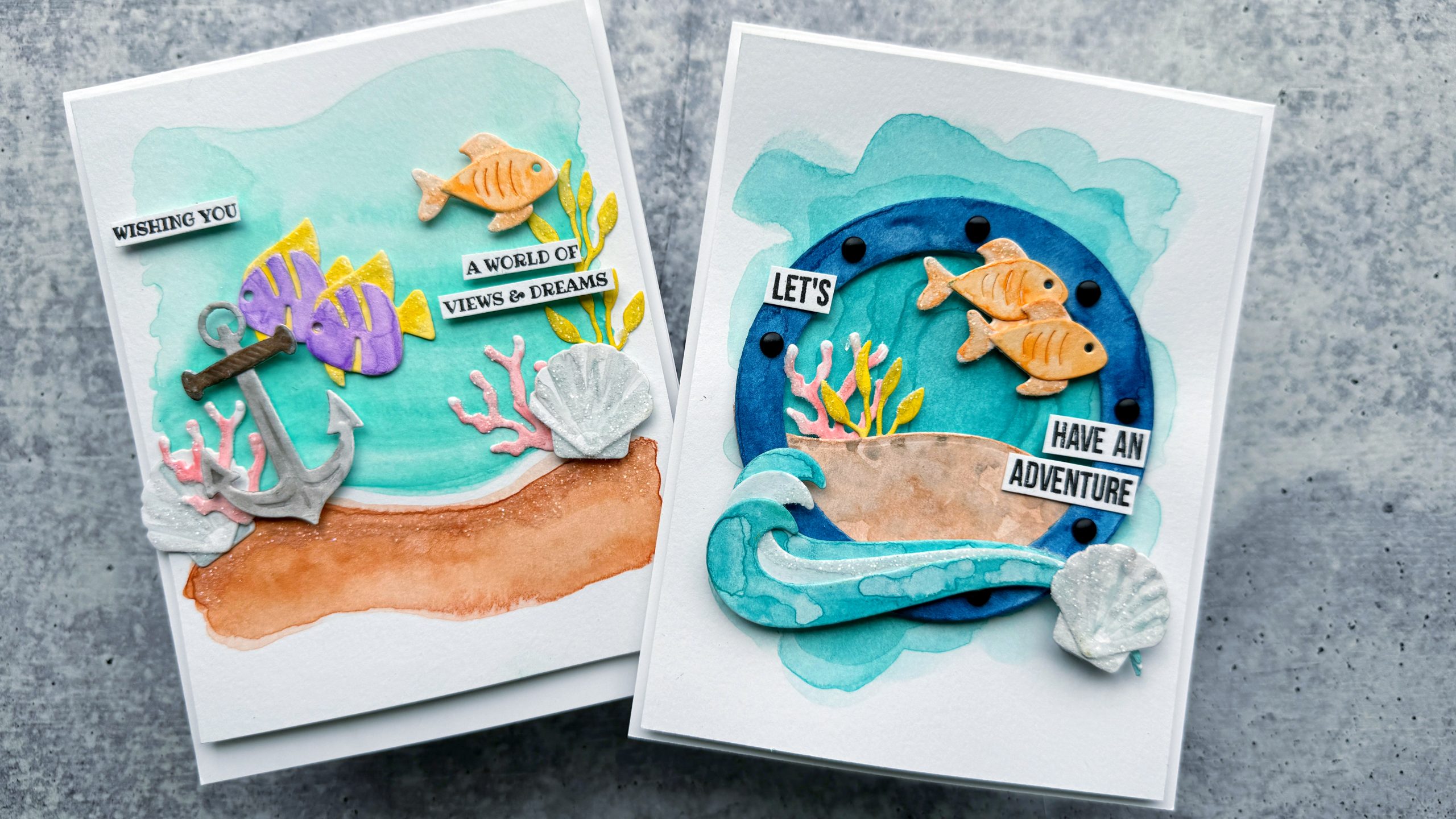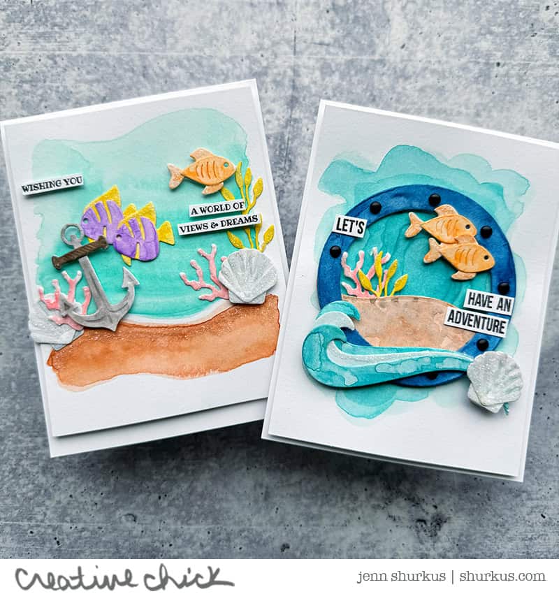The first card has more of an open ocean floor scene with the anchor as the focal point, while the second features a porthole frame that really pulls the whole nautical vibe together. Two totally different looks, same basic supplies and process, I love when that happens!