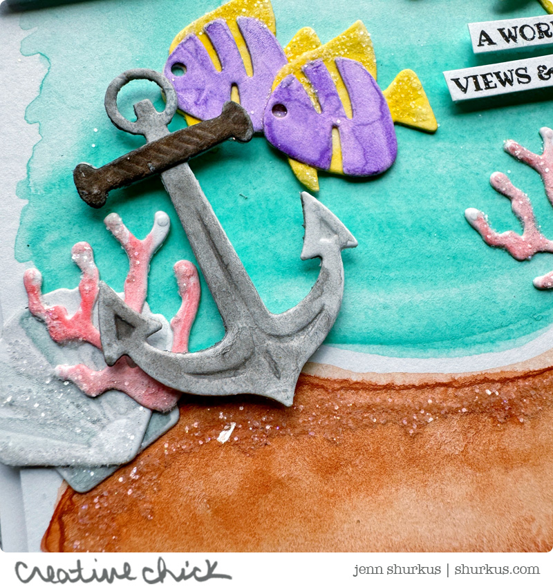 For both cards, I diecut all the elements first. The fish, coral, seaweed, shells, waves, and anchor, and then added color using Distress Watercolor Pencils. I just love how soft and organic watercolor pencils look on diecut pieces. The backgrounds were freehanded with the watercolor pencils too, which gives them that loose, painterly feel I was going for.