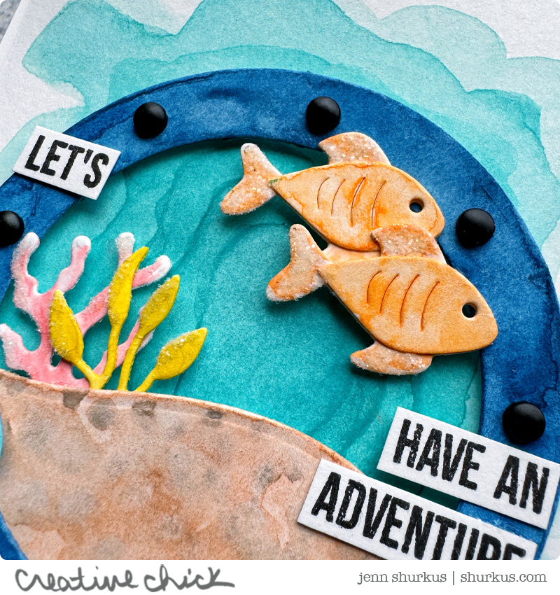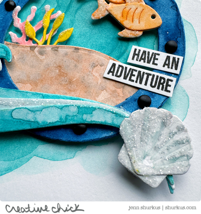 Once everything was assembled, I added the sentiments “word-fetti” style, which is one of my favorite ways to add a sentiment to a card. Those little stamped snippets feel so playful and casual. To finish things off, I added some mini brads to the port hole, and I applied Distress Rock Candy Glitter with Distress Collage Medium for just a hint of shimmer and texture. It gives the pieces that little something extra without going overboard (pun intended!).