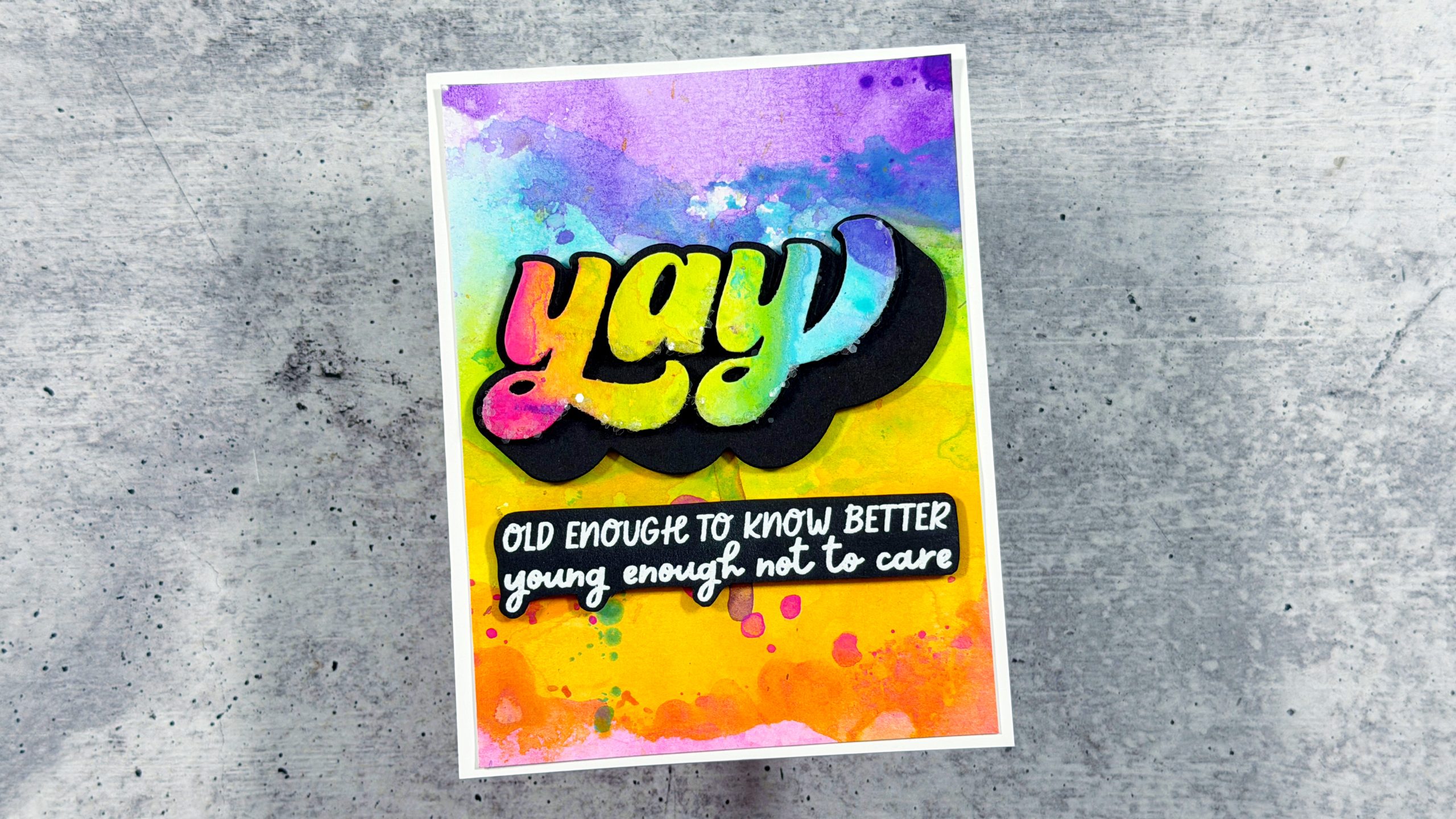 I created two separate backgrounds so I could stretch those juicy colors even further. From one of the panels, I die cut the new Yay dies from Spellbinders, and then cut the shadow layer from black cardstock to really make those colors pop. That crisp black outline gives it that graphic, almost retro feel that I can’t get enough of.
