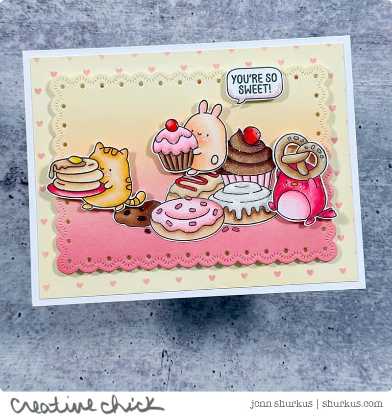 For a subtle pattern in the background, I used the Tiny Spaced Hearts stencil from Simon Says Stamp. It adds just the right amount of interest without taking away from the star of the show, the critters and treats.