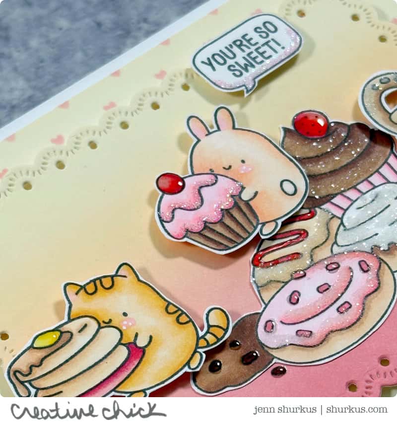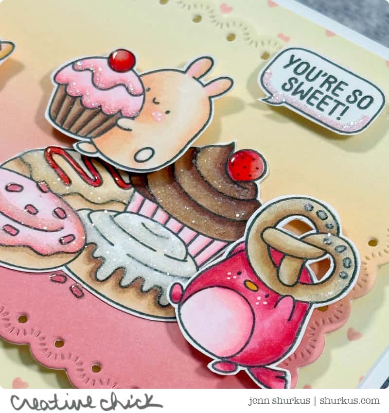 The images from Sweet Treat Critters were colored and then embellished to really bring those desserts to life. A touch of Ranger Glossy Accents gives the frosting and cherries that yummy shine, while Distress Rock Candy Clear adds sparkle and texture that makes everything feel extra special. These small details truly make the sweet treats pop off the card.