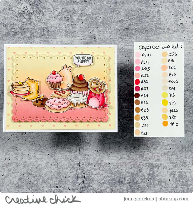 For this card, I used some recently released stamps and dies from Simon Says Stamp, and they could not be more perfect for love-filled occasions. The Sweet Treat Critters are absolutely adorable, and pairing them with all of the yummy desserts instantly made me smile.
