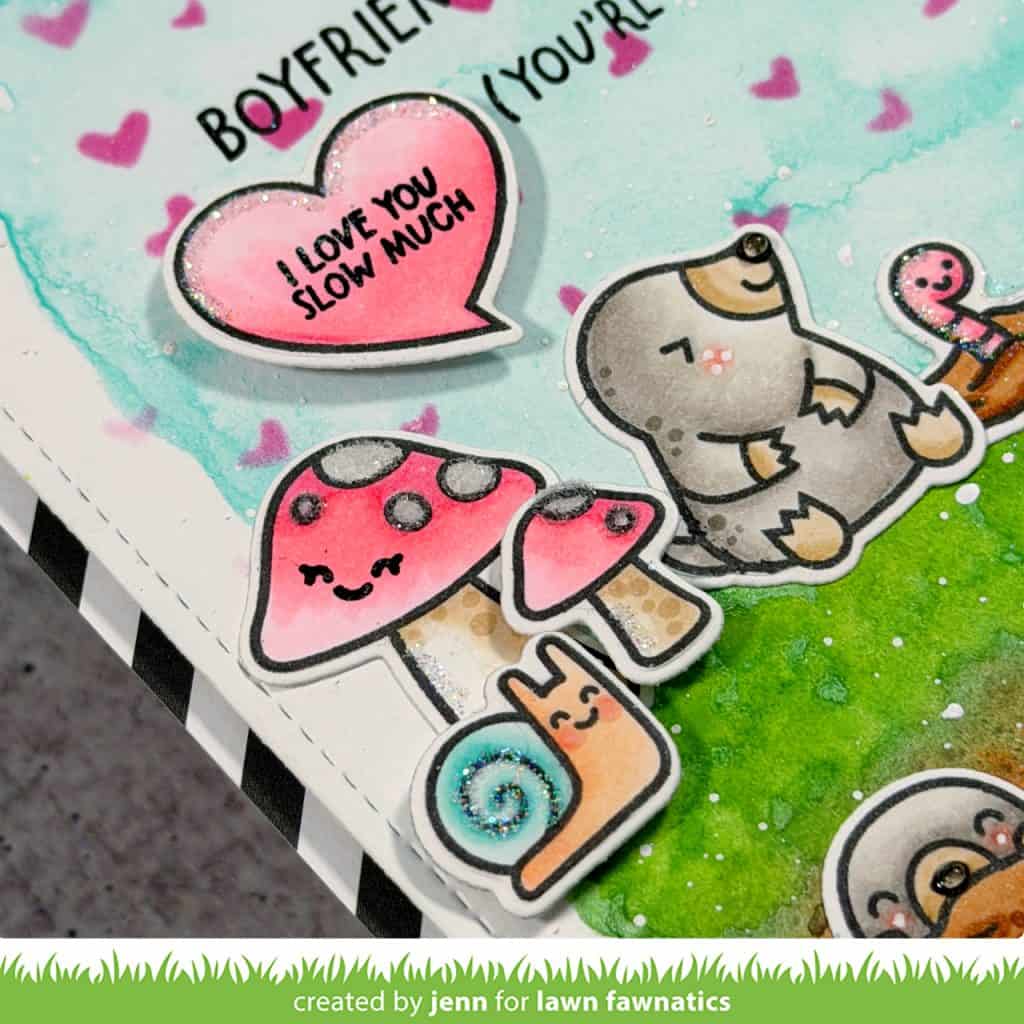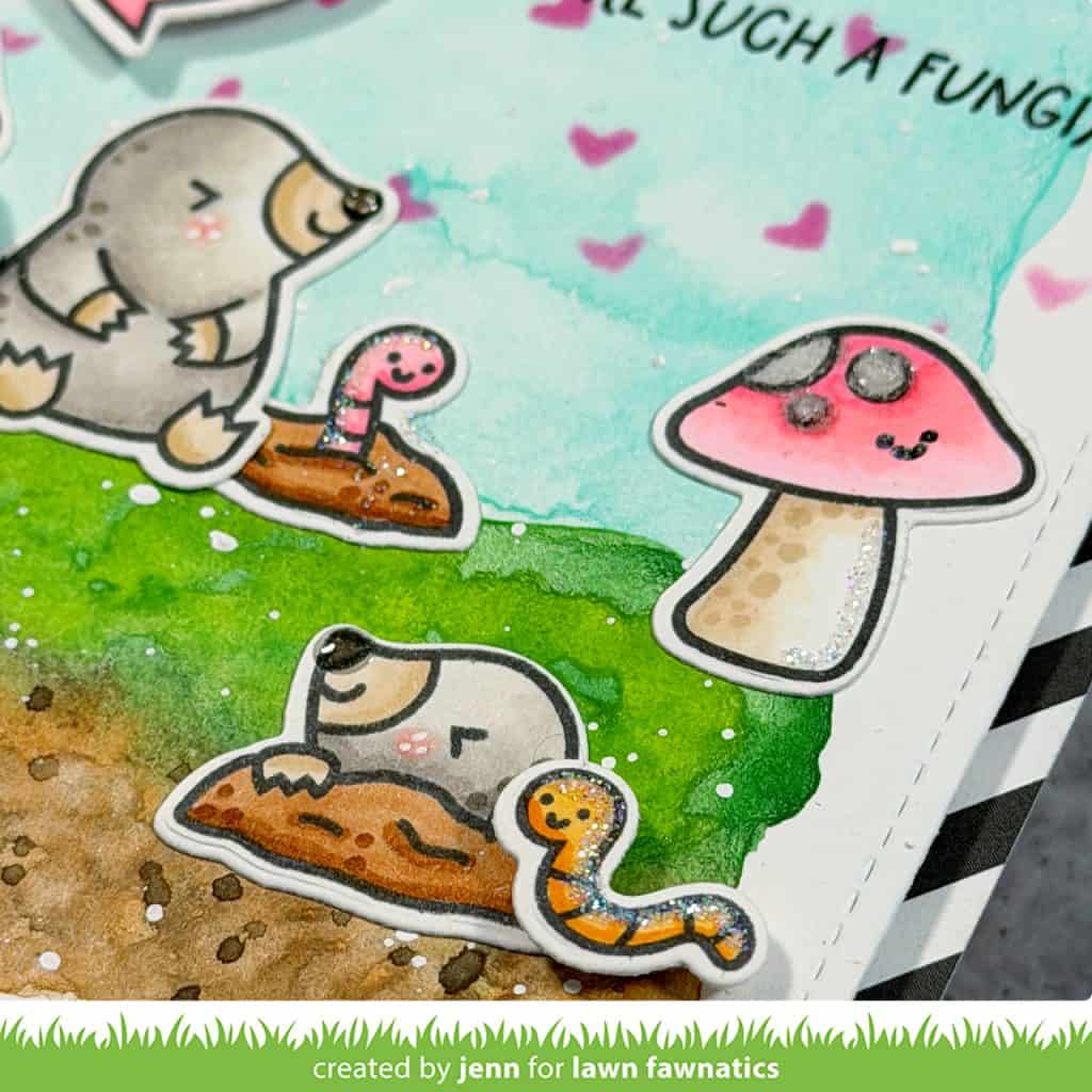 For a little extra sparkle, I used Prisma Glitter applied with a Quickie Glue Pen on the snail shell, the worms, the mushroom stems, and the heart speech bubble—just enough shimmer to catch the light without overpowering the scene.