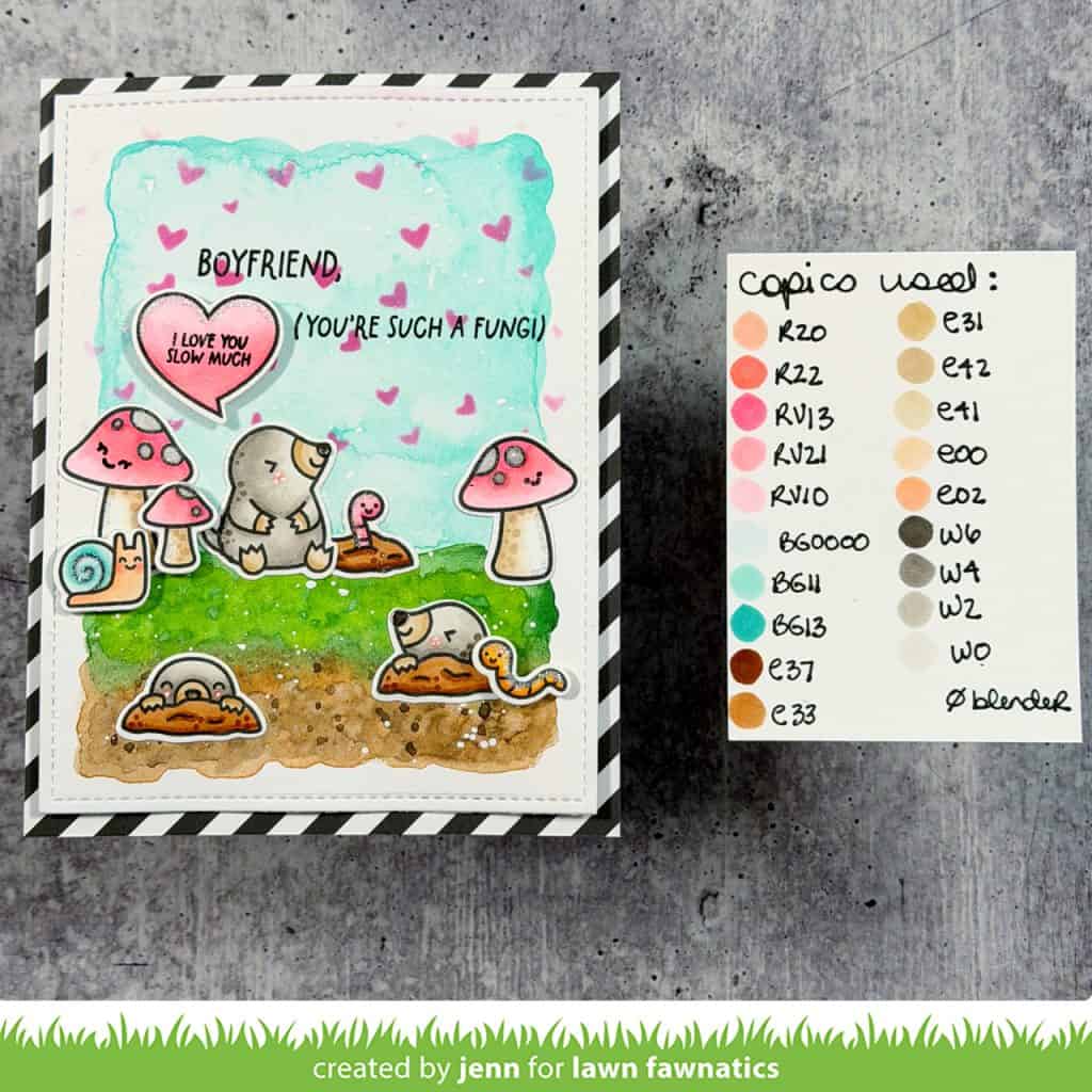 For this card, I started by coloring the moles from A Mole Lot of Love and the mushrooms from To My Fungi using Copic markers. I’m sharing the color swatches I used below. If you’d like some extra guidance on coloring these adorable moles, I share one approach in the free Create With Us class, which includes a downloadable handout with coloring guides. I also colored the moles a bit differently in my A Mole Lot of Friends class, and yes, those coloring guides are included there too.