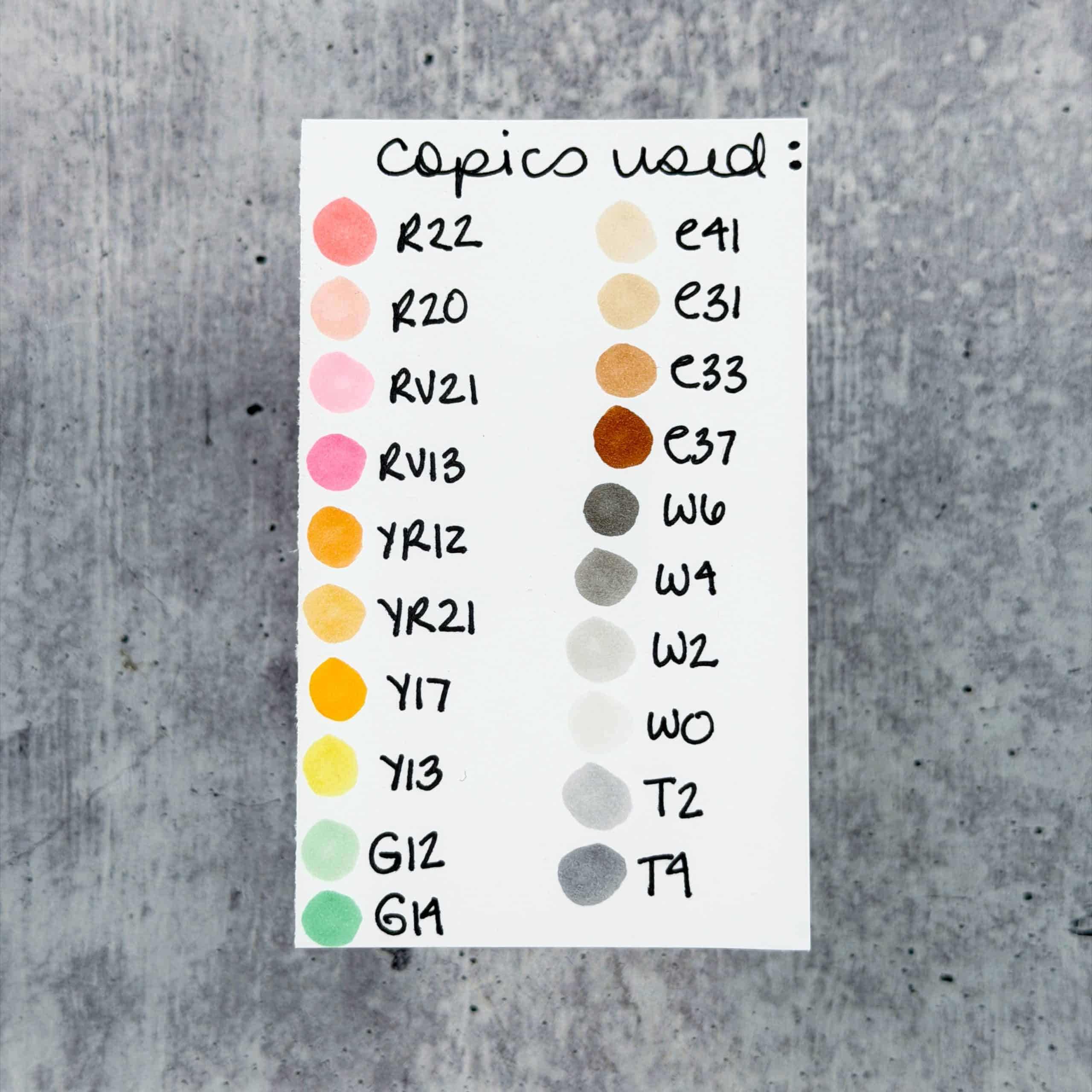 Jenn is also sharing a Copic/OLO comparison chart. Please note that this chart is just for guidance. Colors are not exact matches, and when needed, Jenn has chosen the nearest available shade. Shop OLO markers here.