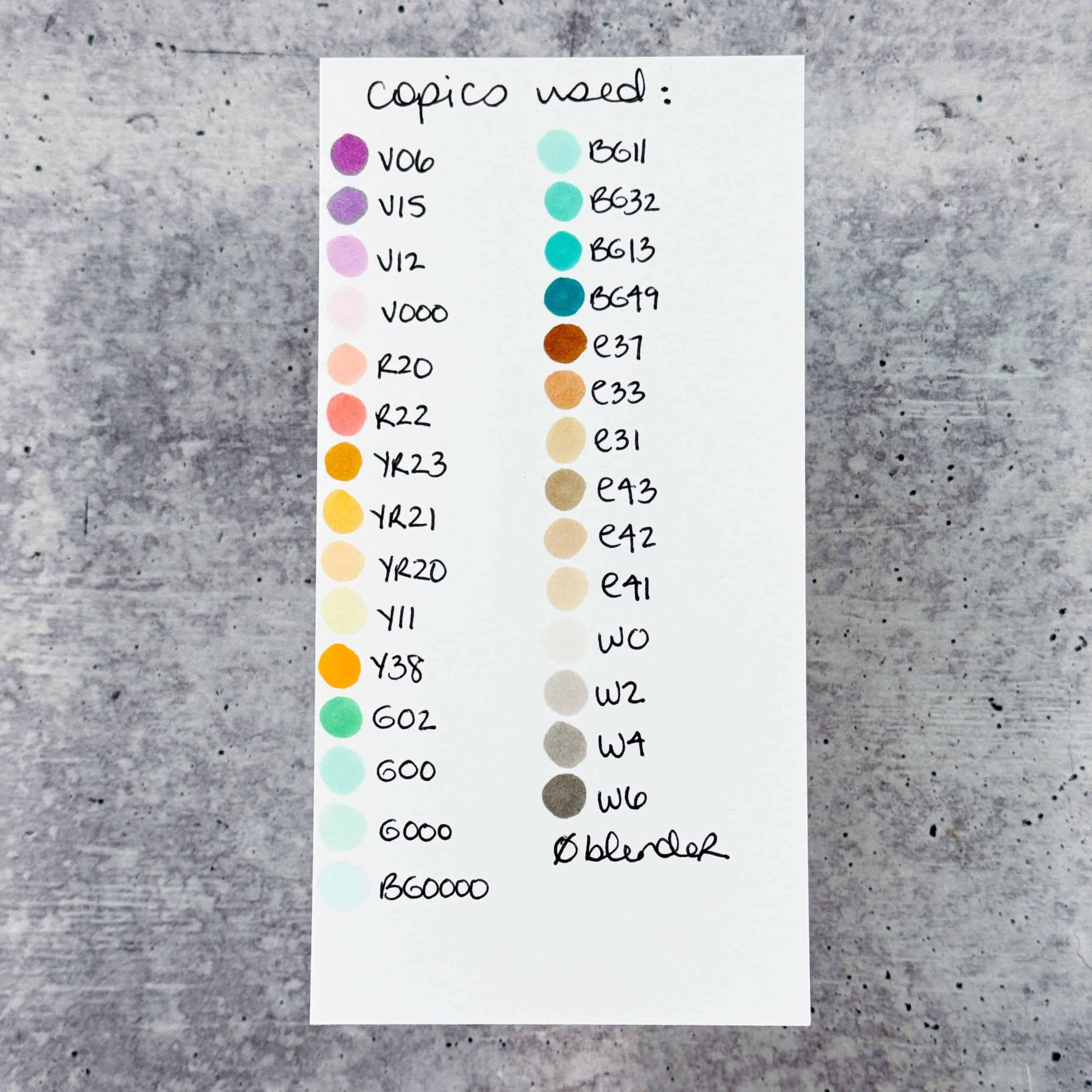 Jenn is also sharing a Copic/OLO comparison chart. Please note that this chart is just for guidance. Colors are not exact matches, and when needed, Jenn has chosen the nearest available shade. Shop OLO markers here.
