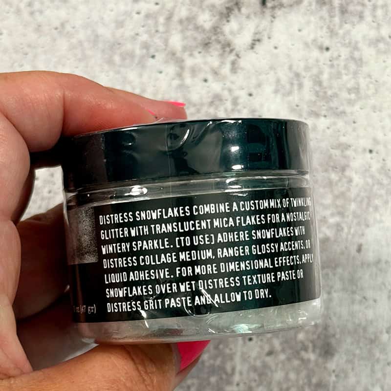 Tim Holtz Distress® Snowflakes combines a custom mix of twinkling glitter with translucent mica flakes for a nostalgic wintery sparkle. Adhere Snowflakes with Distress Collage Medium, Ranger Glossy Accents, or other liquid adhesives. For more dimensional effects, apply snowflakes over wet Distress Texture Paste or Distress Grit Paste and allow to dry. Available in 3 oz (47gr) jar
