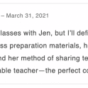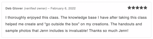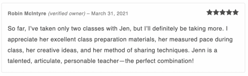 Jenn’s class is full of information and paced so the student can watch the technique then do it with her never feeling left behind. Of curse they are recorded s you can pause or rewind whenever needed as well. S,he encourages using your own supplies when possible but gives all the right tips for the best results. Most of all she encourages us to have fun,which we all need in today’s world.