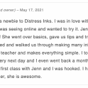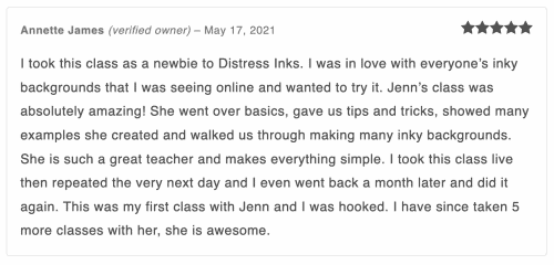 I love Jenn’s classes! So fun, informative, and inspiring! I can’t wait to play more with my inks and sprays now that I have learned some new techniques. If you’re considering taking one of her classes, GO FOR IT! You won’t regret it.
