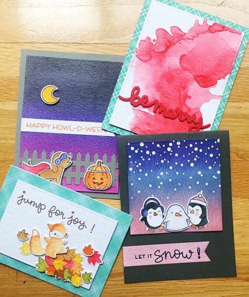 All of these cards are ones I designed with Lawn Fawn stamps, dies inks and papers. All of these kits are from previous classes I taught. Please keep in mind all of them are hand produced.