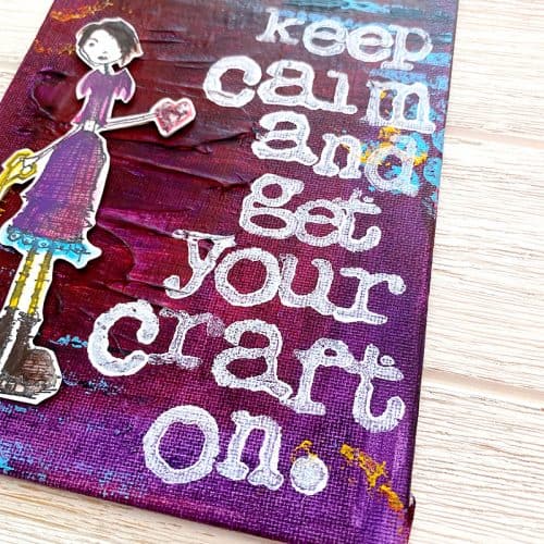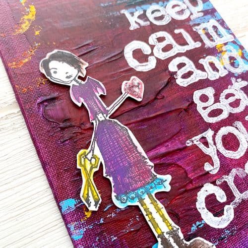 Original mixed media painting created by Jenn on canvas board, created using acrylic paint, unique paper material, stamps, and other fun supplies.