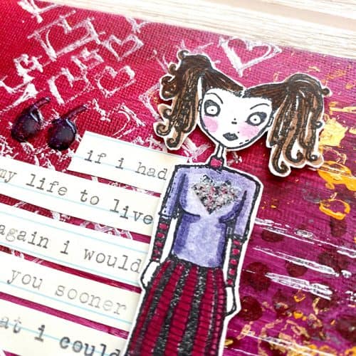 Original mixed media painting created by Jenn on canvas board, created using acrylic paint, unique paper material, stamps, and other fun supplies.