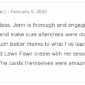 I’m new to Jenn’s classes and now I’m hooked! I’ve signed up for a bunch more, including past classes. They are so much fun! Jenn is a very friendly, patient teacher who obviously cares about her students. She makes every effort to make sure we have fun, learn and create wonderful cards. I adore her classes and look forward to many more!