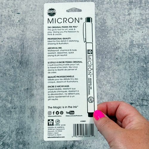 The Sakura Pigma Micron fine-point pens feature waterproof, quick-drying pigmented ink for permanency and true color reproduction. Experience smooth, skip-free writing and crisp ink color that leaves consistent lettering and lines every time. The archival ink is chemically stable and fade-resistant. It does not smear, feather or bleed through on most papers. Black, fine line, .50MM