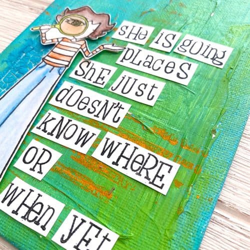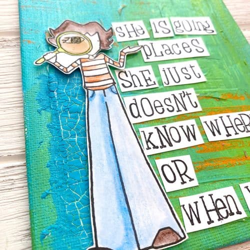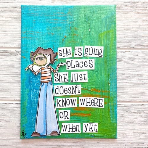 Original mixed media painting created by Jenn on canvas board, created using acrylic paint, unique paper material, stamps, and other fun supplies.