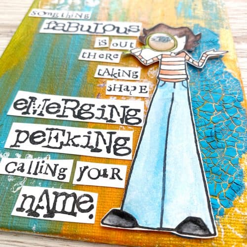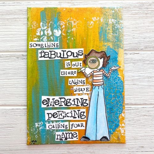 Original mixed media painting created by Jenn on canvas board, created using acrylic paint, unique paper material, stamps, and other fun supplies.