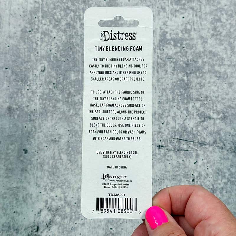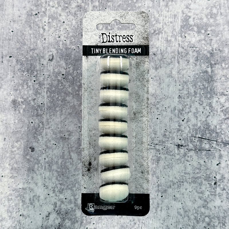 For use with the Tim Holtz Distress® Tiny Blending Tool (sold separately).  The tiny blending foam attaches easily to the tiny blending tool for applying inks and other mediums to smaller areas on your craft projects.  To use:  Attach the fabric side of the tiny blending foam to the tool base.  Tap foam across surface of ink pad. Rub tool along the project surface or through a stencil to blend color.  Use one piece of foam for each color or wash foams with soap and water.  Allow to air dry.  9 foams