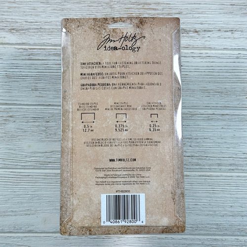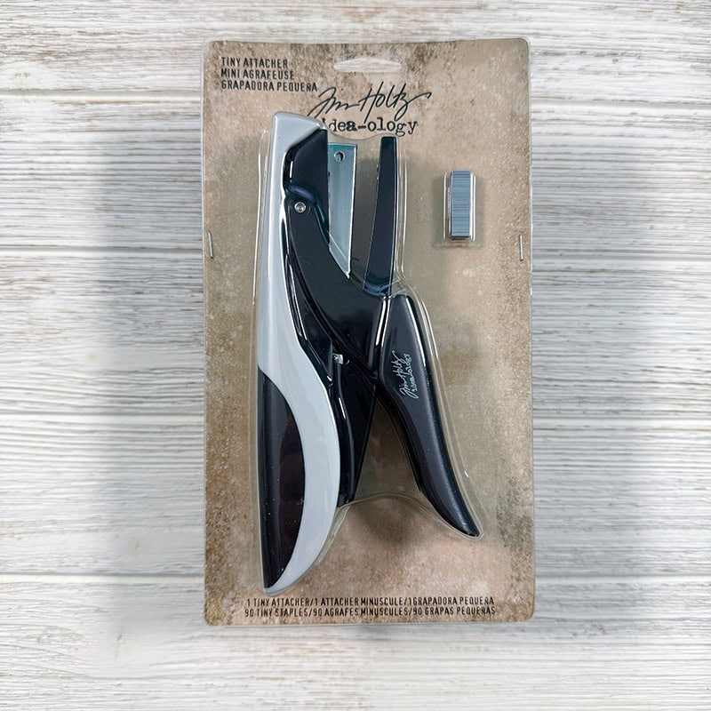 The Tiny Attacher is smaller than a standard stapler and even smaller than a mini stapler. It’s perfect for attaching ribbon and other elements to projects. The Tiny Attacher comes with 100 tiny staples. The staples measure approximately 1/4 inch across.